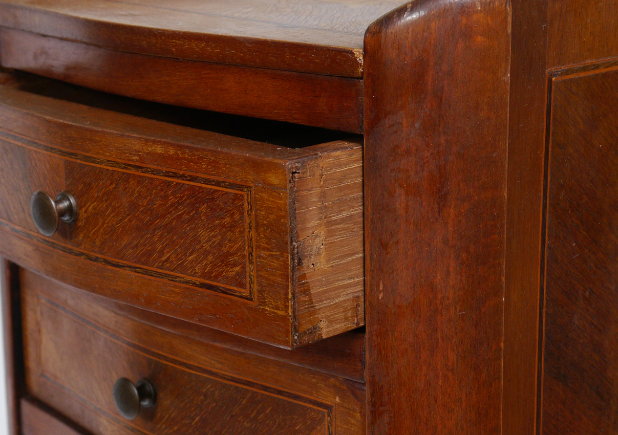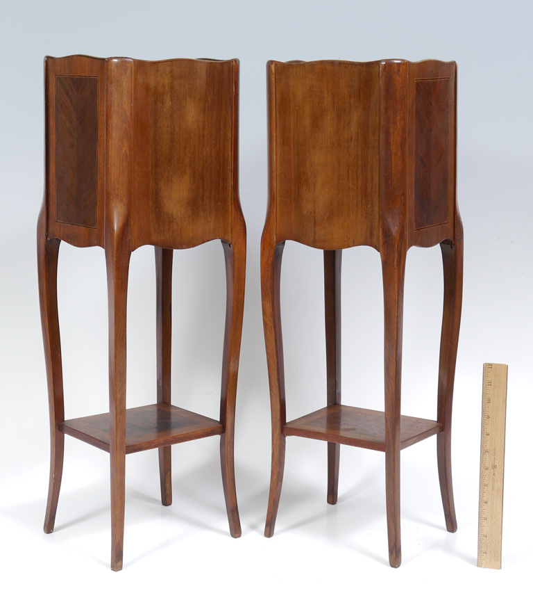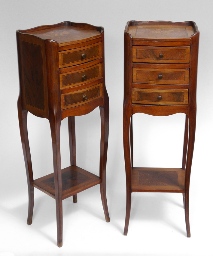 PAIR DIMINUTIVE MARQUETRY INLAY STANDS: French 3 drawer stands, the top with inlay floral design, legs joined by stretcher shelf. Measure approx. 20'' tall x 9 1/4'' x 8 1/4''. Doris Baker-Mansergh Estate