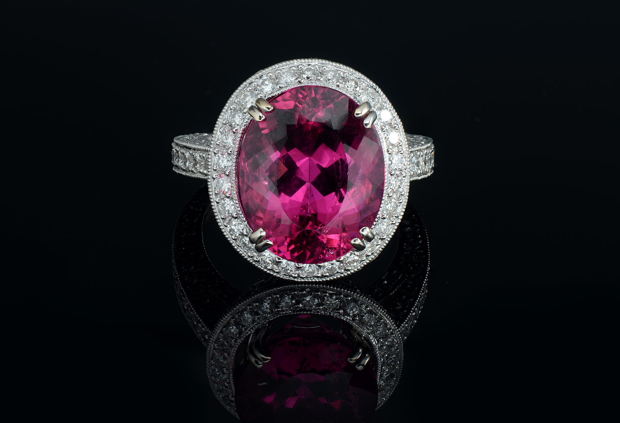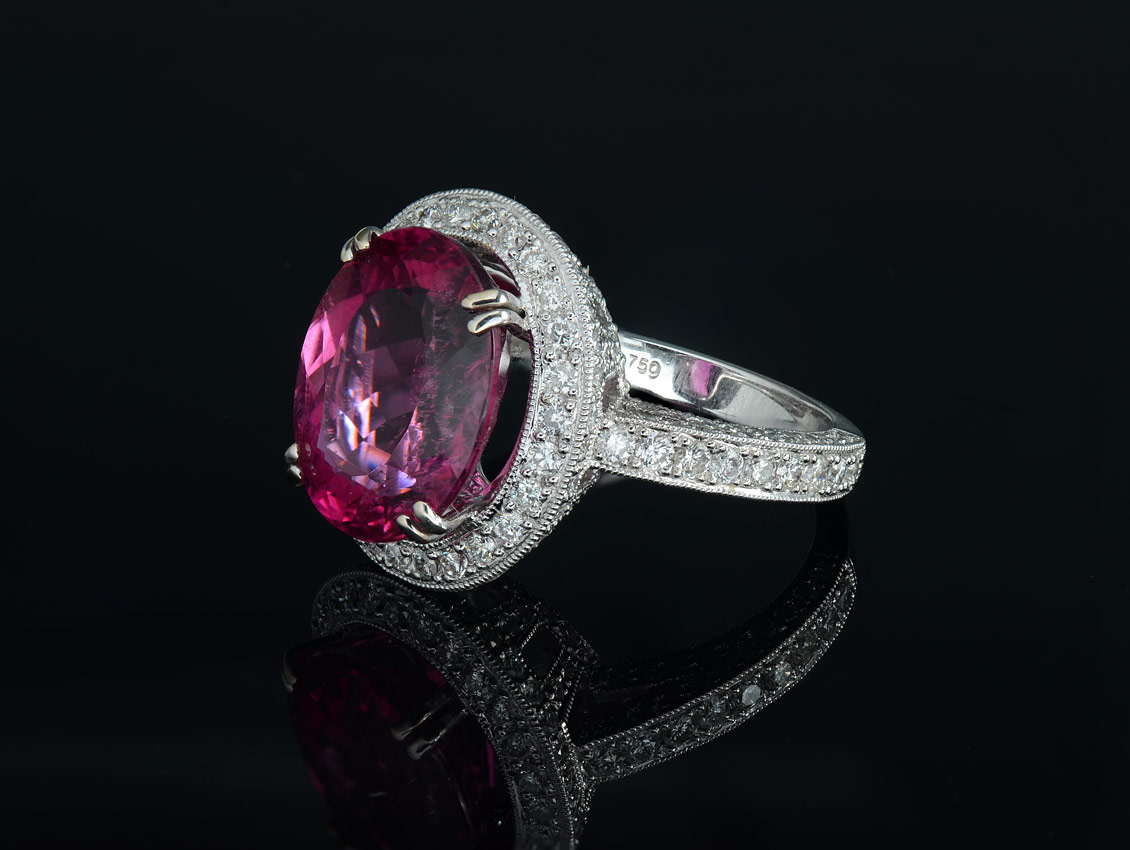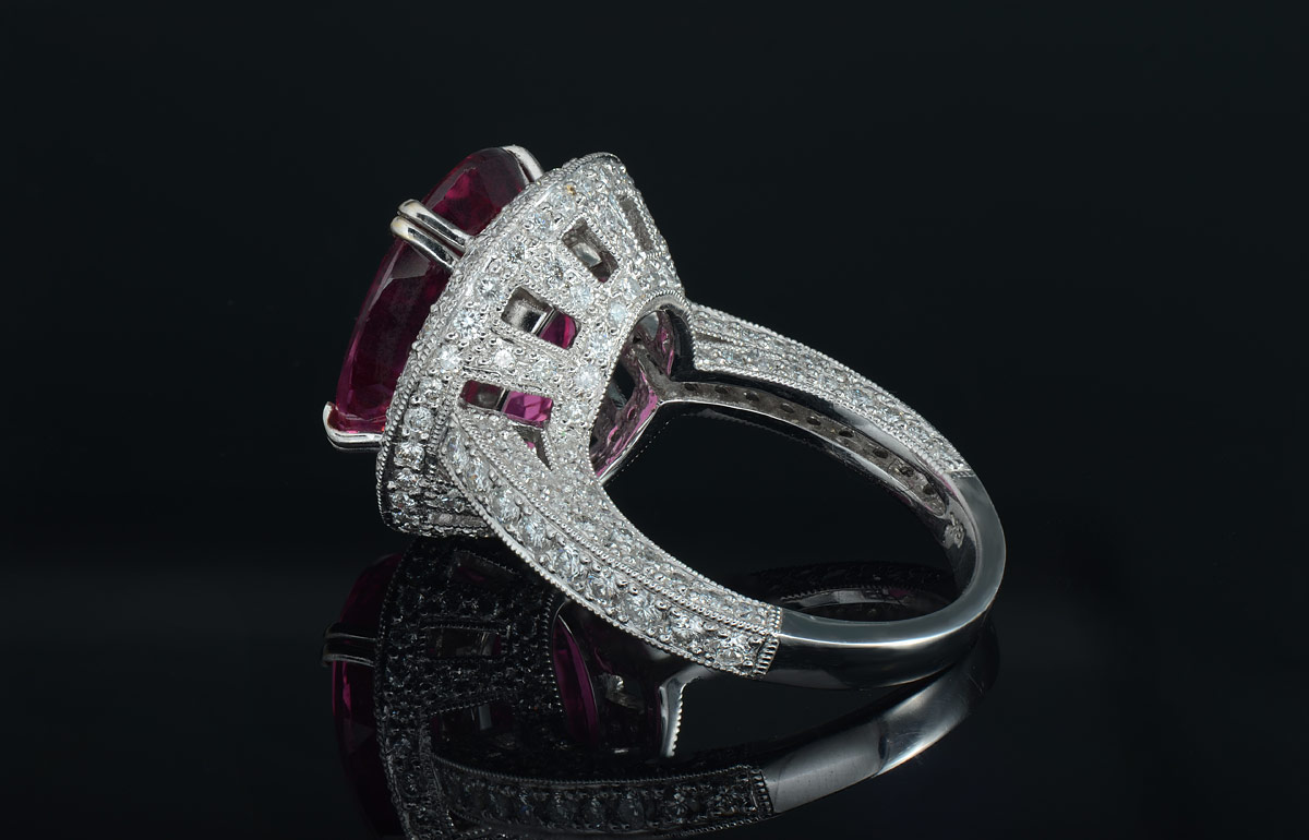 9.62 CT RUBELLITE TOURMALINE RING WITH DIAMONDS: 18K white gold ring centering a gorgeous 9.62 Ct oval mixed cut rubellite of VVS clarity, strP hue, and 4 saturation. The mounting is micro bead set with 198 round brilliant diamonds totaling approx. 2.53 Ct, VS clarity and G-H color. Size 6.75. Weight 11.2 grams. Sold with current Atlanta Gemological GIA graduates appraisal for $18,450.
