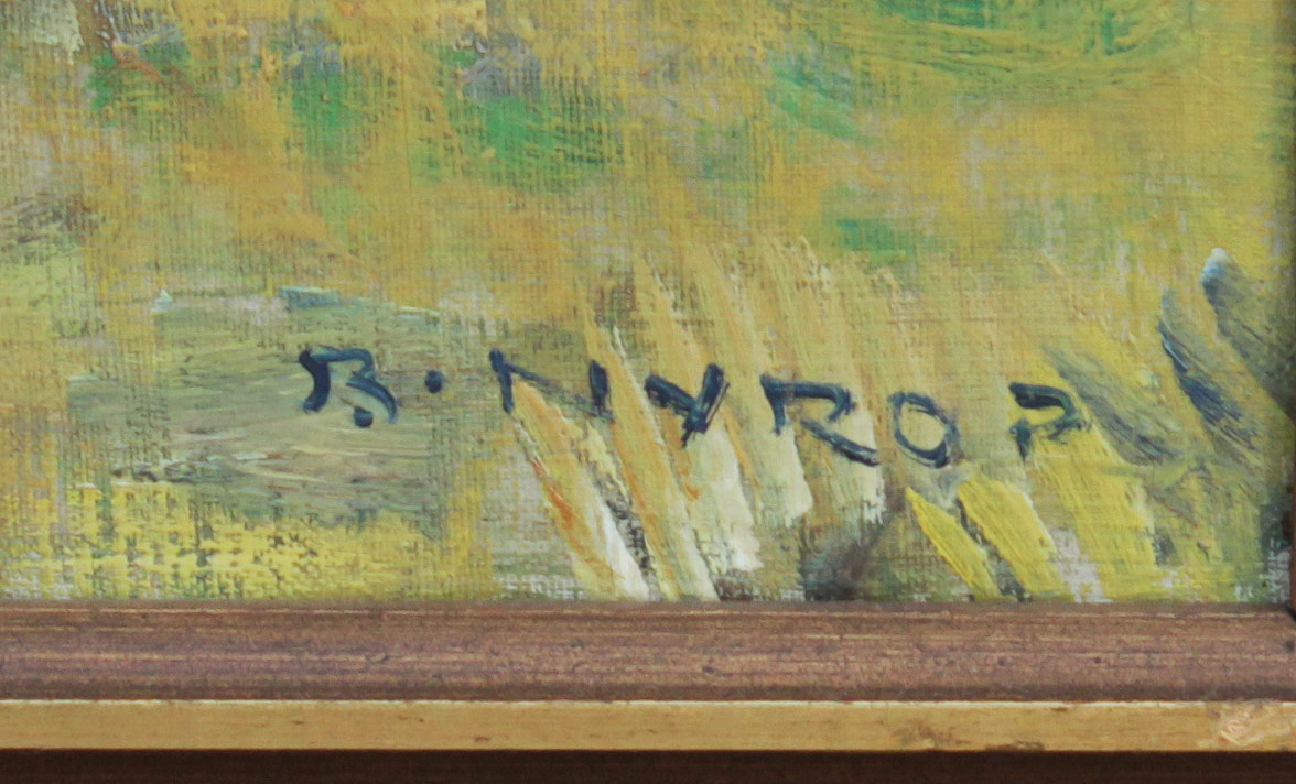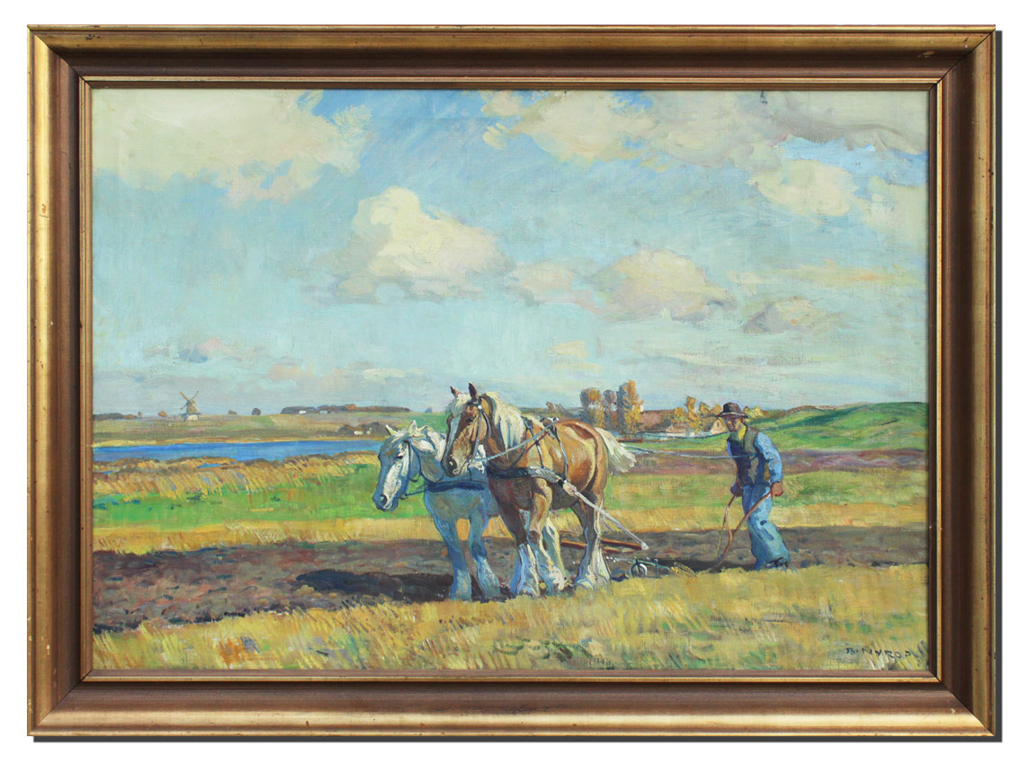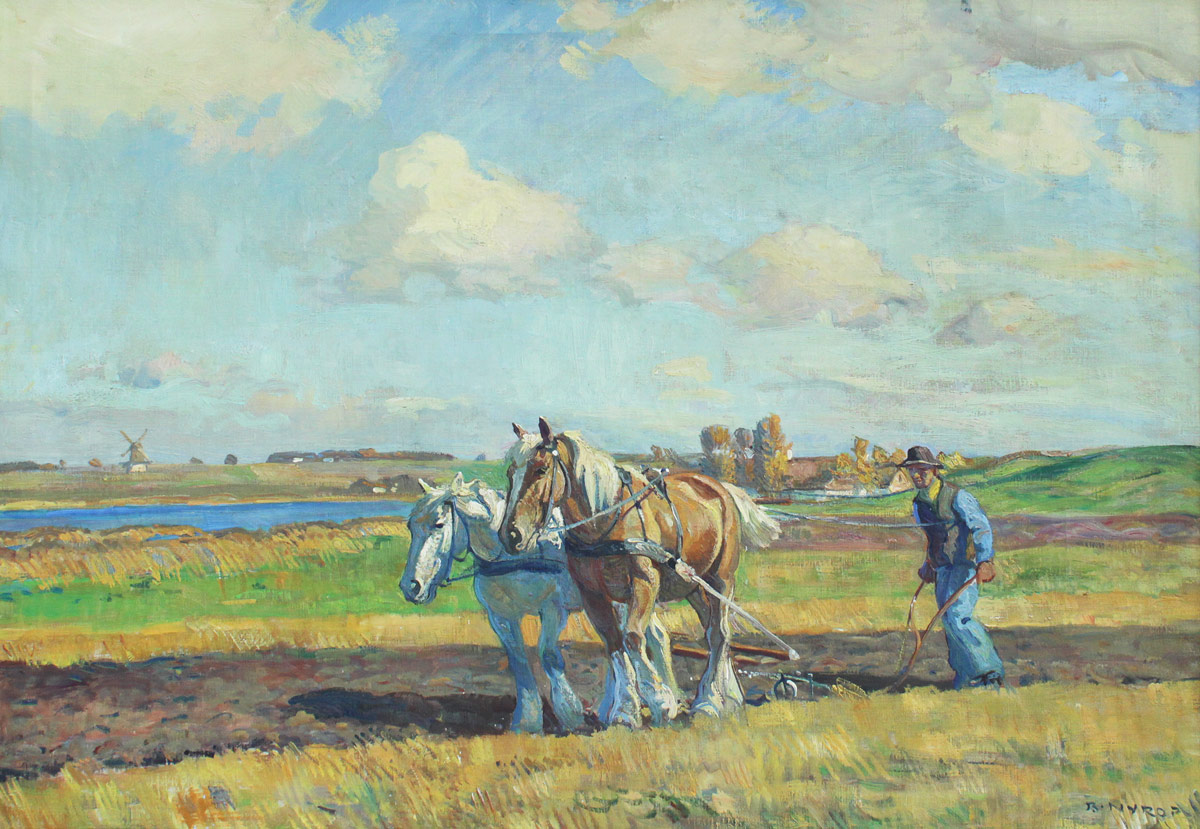 NYROP, Borge, (Danish, 1881-1948): Panoramic Dutch Plowing Scene with Horses and Farmer, Windmills in the Distance, Oil/Canvas, 27 5/8'' x 39 5/8'', signed lower right, gilded frame with wear, 33 1/2'' x 45''.