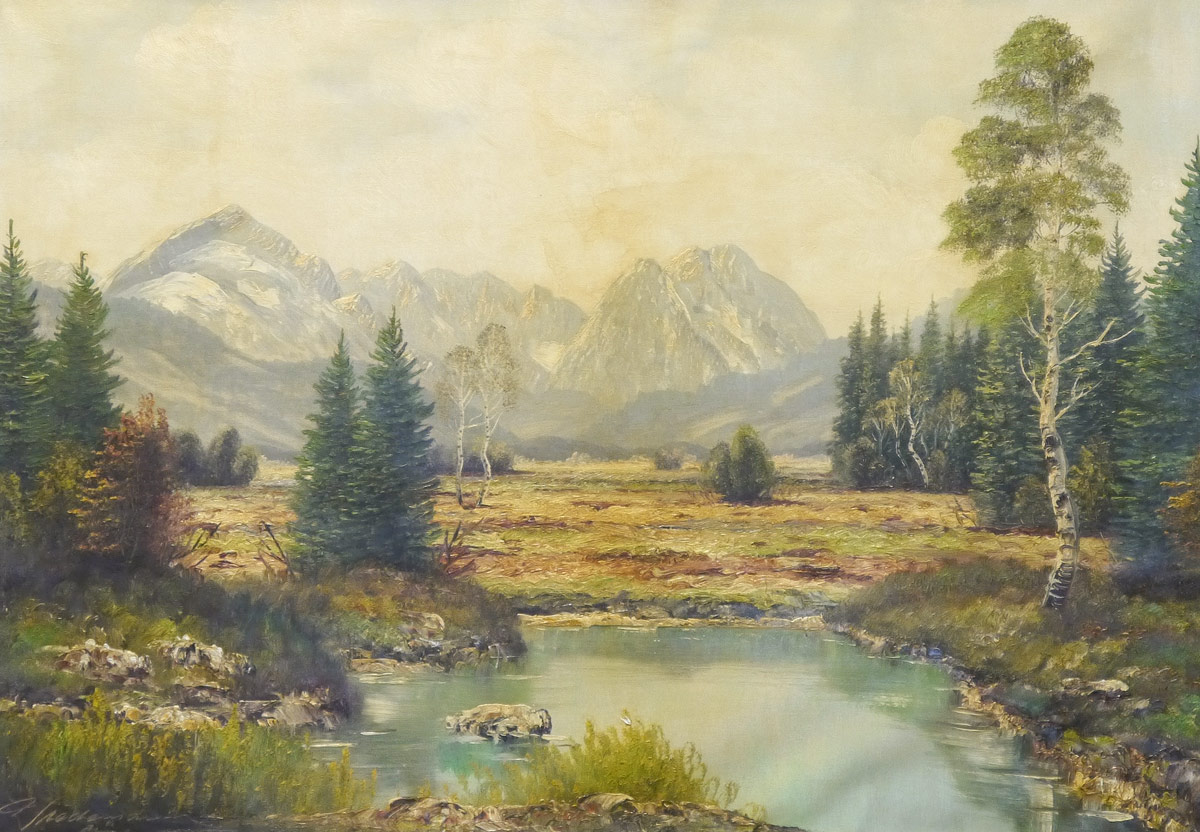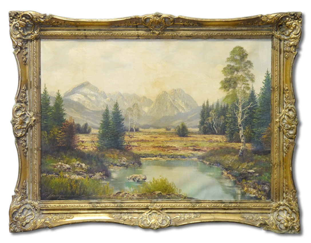GERMAN ALPINE LANDSCAPE PAINTING LUDWIG WIEDEMANN: Moor Am Wettrstein, Oil/Canvas, 28'' x 39 3/8'', signed lower left, Munchen, signed and titled verso, elaborate gilded and carved frame with wear, 36'' x 48''.