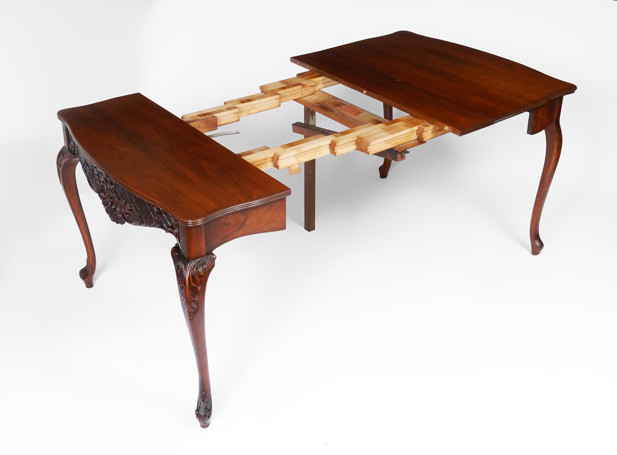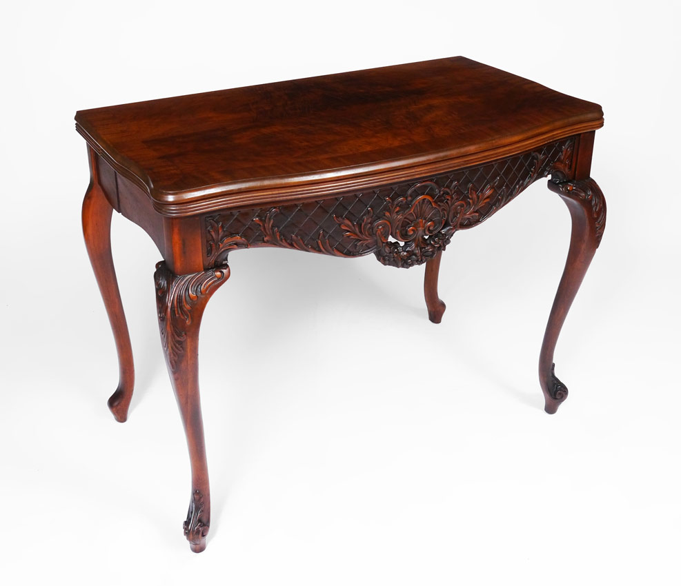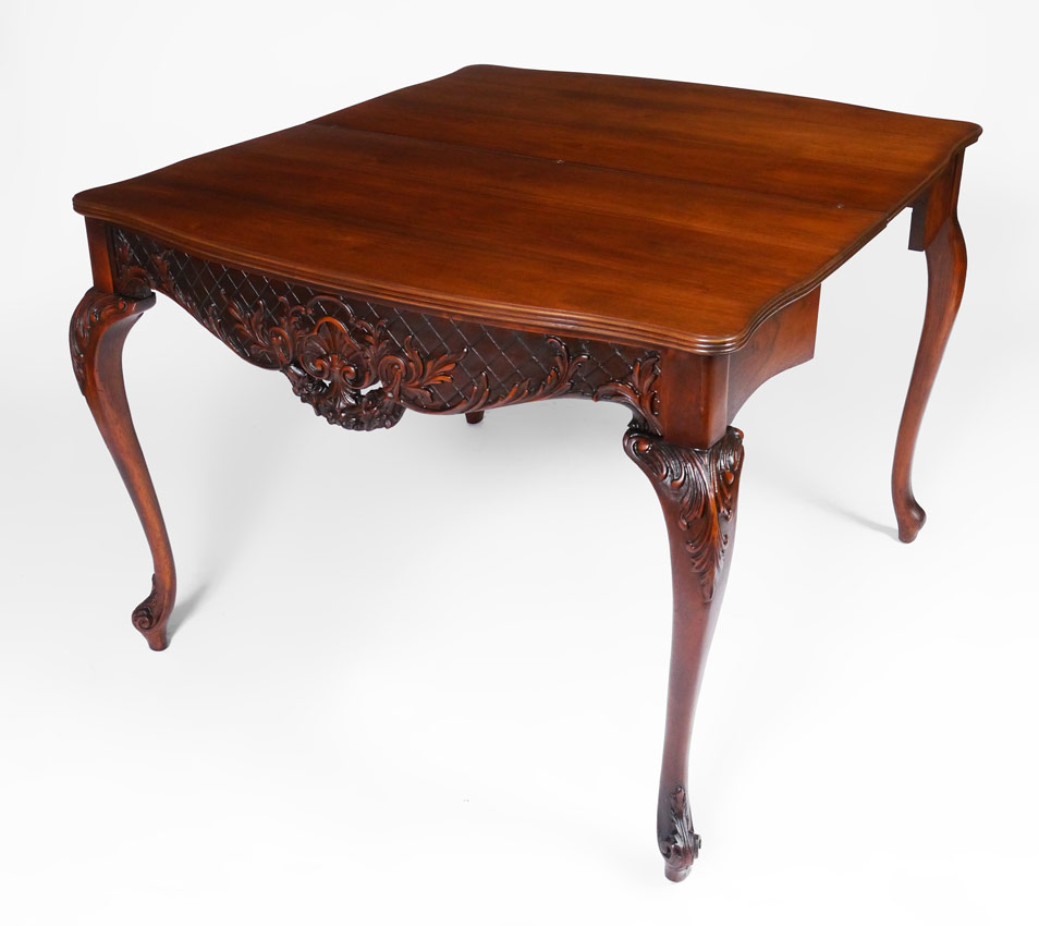 VICTORIAN CARVED MAHOGANY EXTENSION TABLE: From B. Walter & Co., mahogany flip top with carved skirt and front knees on cabriole legs. 29 3/4'' h. x 38 1/4'' x 20''. Unfortunately no leaves. Doris Baker-Mansergh Estate