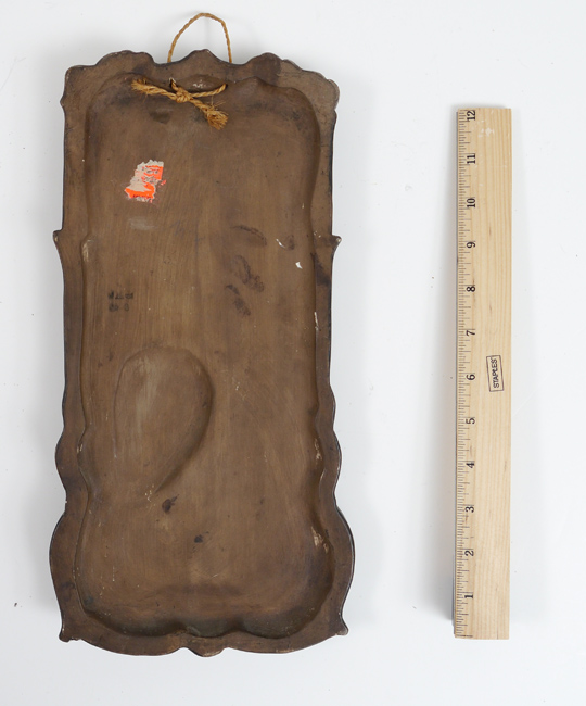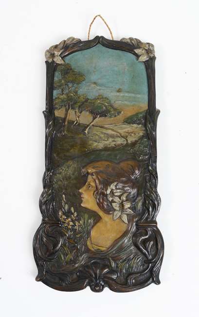 JOHANN MARESCH ART NOUVEAU TERRACOTTA WALL PLAQUE: Classic Nouveau maiden with flowing hair in the forefront of a scenic landscape. Signed J.M. with the numeral 45, overall 14'' x 7''.