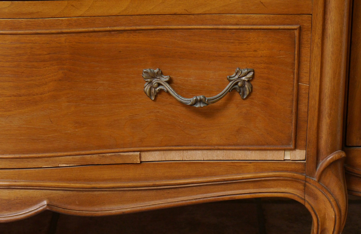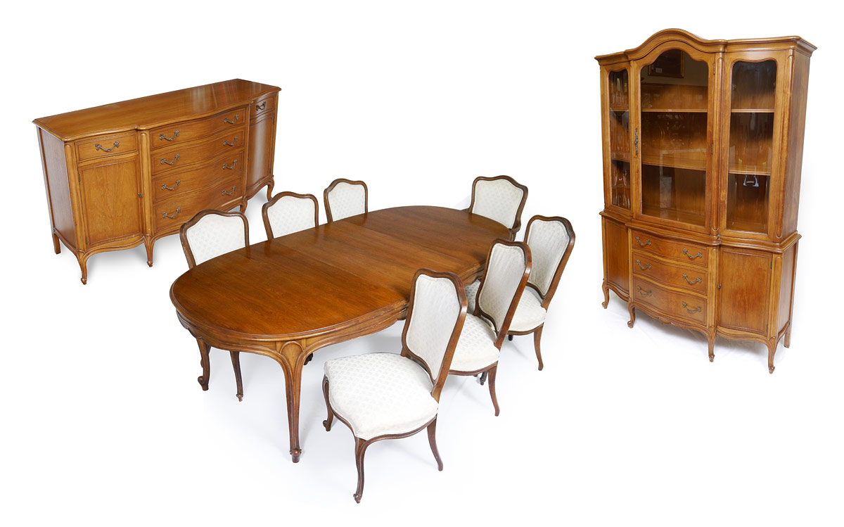 DREXEL COUNTRY FRENCH STYLE DINING SET: 10 pieces to include TABLE (30'' h. x 68'' x 46''), 3 LEAVES (12 1/4''), 7 CHAIRS (1 arm 38 3/4'' x 24 1/2'' x 25'' and 6 side), SERVER (35 1/2'' h. x 64 1/2'' x 22 1/2'') and china CABINET (74 3/4'' x 54'' x 22 1/2'').