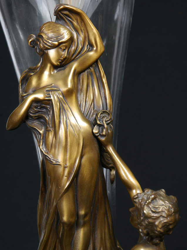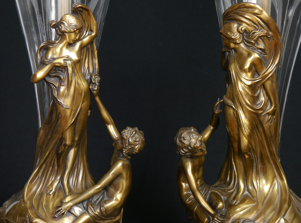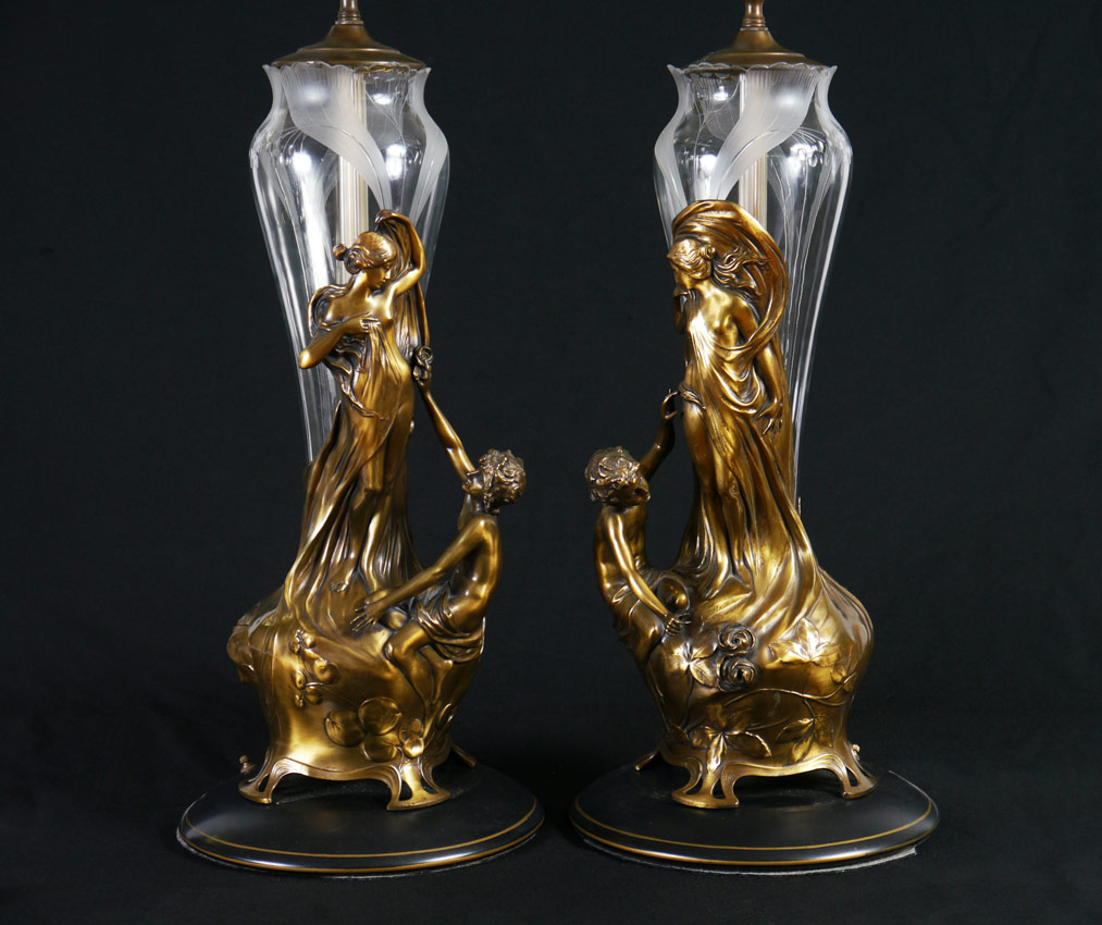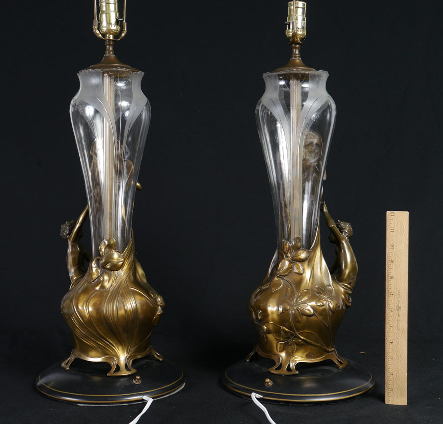 PAIR ART NOUVEAU FIGURAL BRONZE LAMPS: Similar but not identical with figural maiden and boy below. Etched and cut glass vase form inserts, mounted to painted wooden base. Unsigned. Newer lamp fixtures. 36'' h. x 10 1/4'' base dia.
