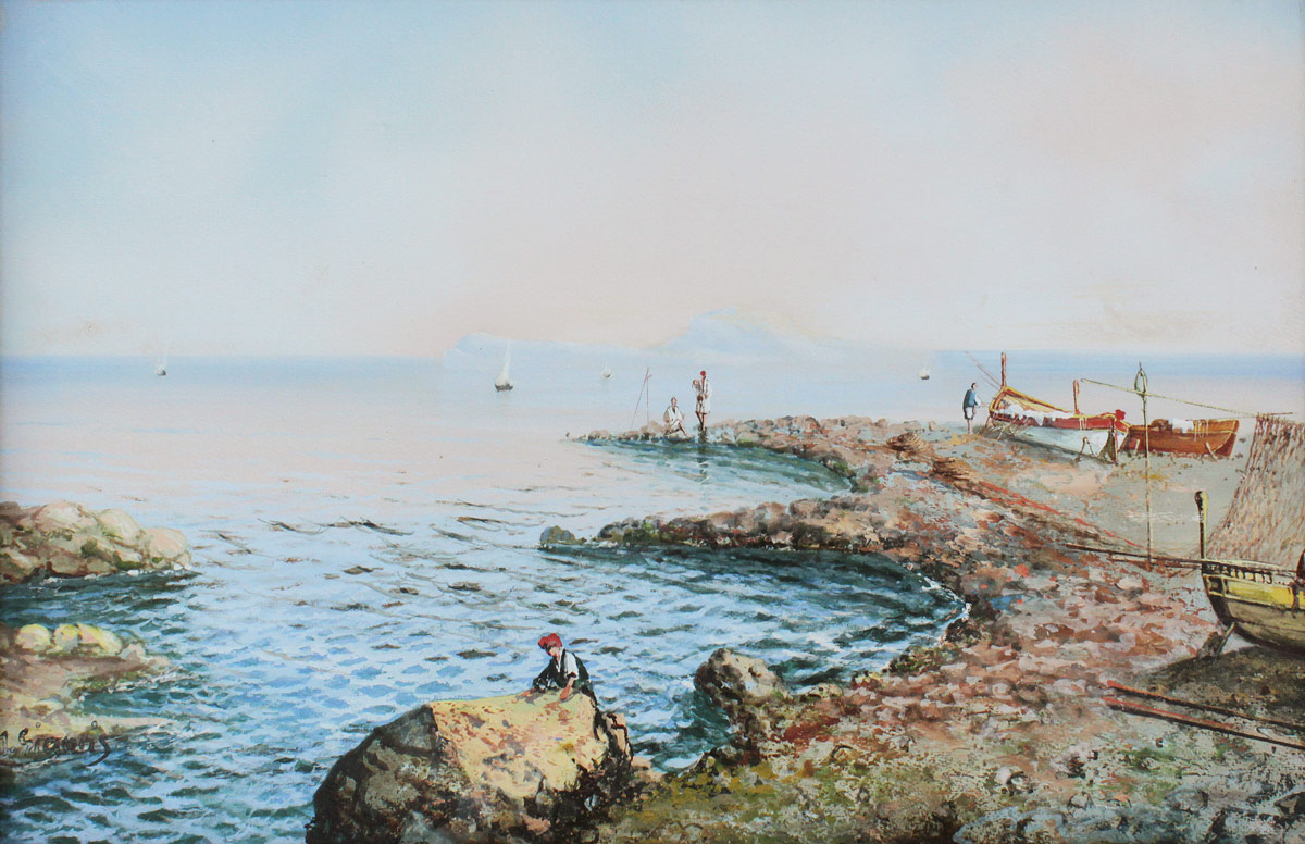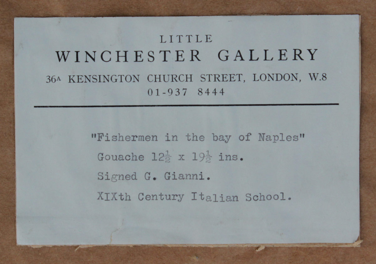 GIANNI, Gian, (Italian, 1837- ): ''Fishermen in the Bay of Naples'', Gouache, Sight size 12'' x 19 1/4'', signed lower left, framed 18'' x 22'', Winchester Gallery label affixed verso.