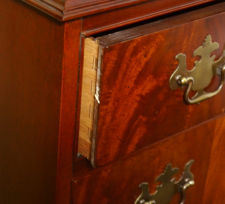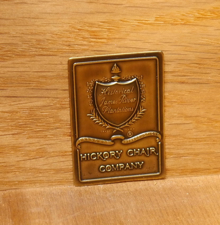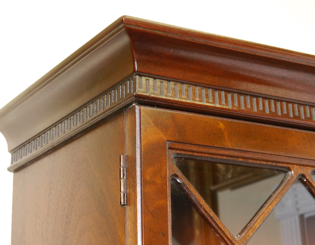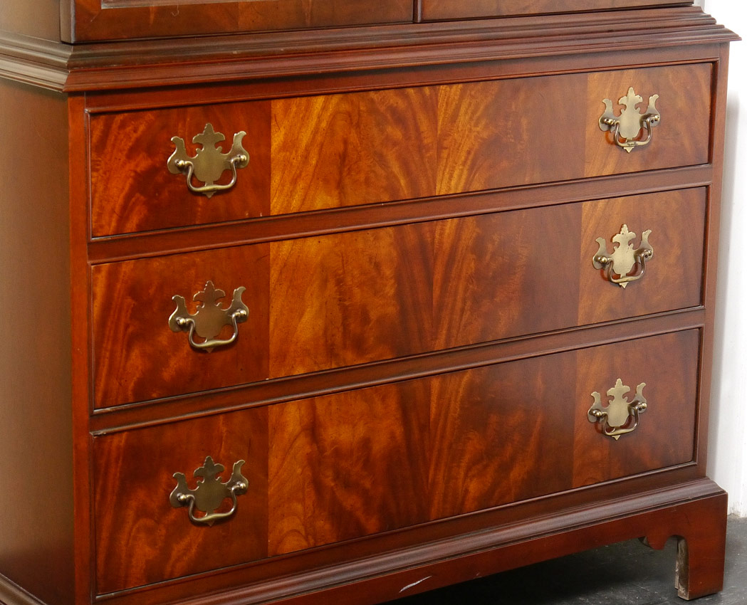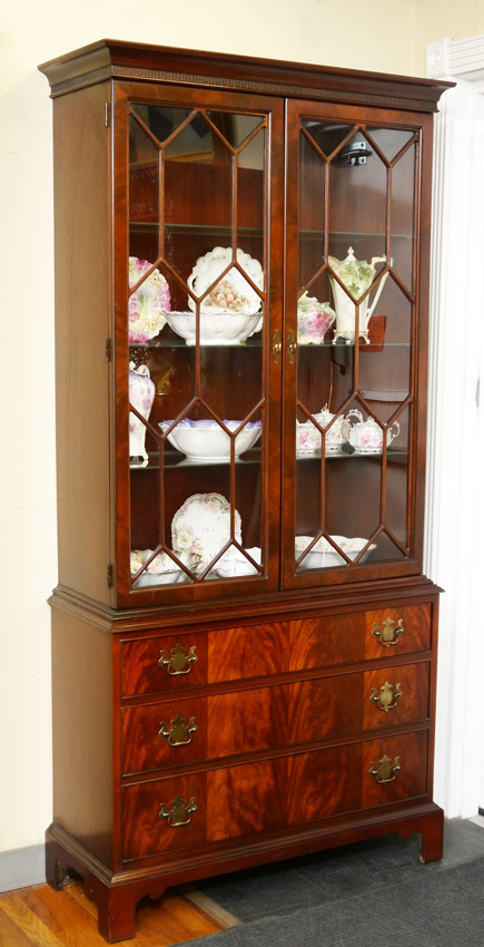 HICKORY CHAIR CO. CHIPPENDALE STYLE CHINA CABINET: 2 glass door top with fretwork, 3 glass shelves. Mahogany veneer base with 3 graduating drawers, brass pulls. Bracket feet. 79 3/4'' h. x 38 1/2'' x 15 1/2''. From the Doris Baker-Mansergh Estate