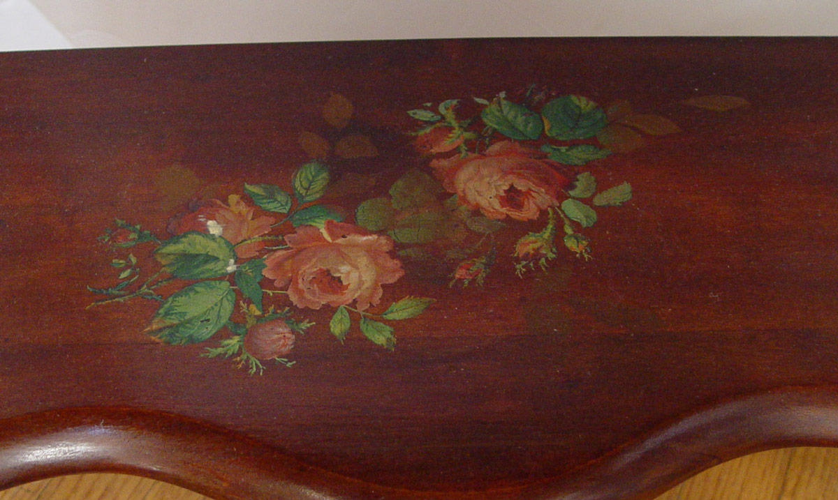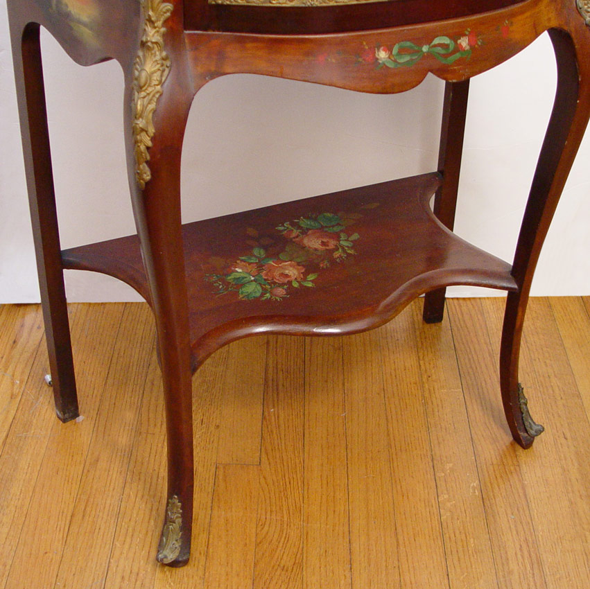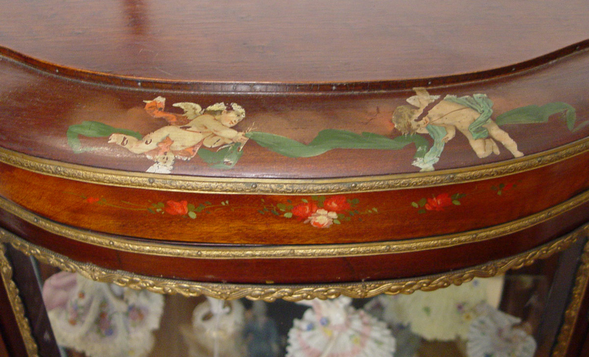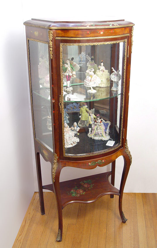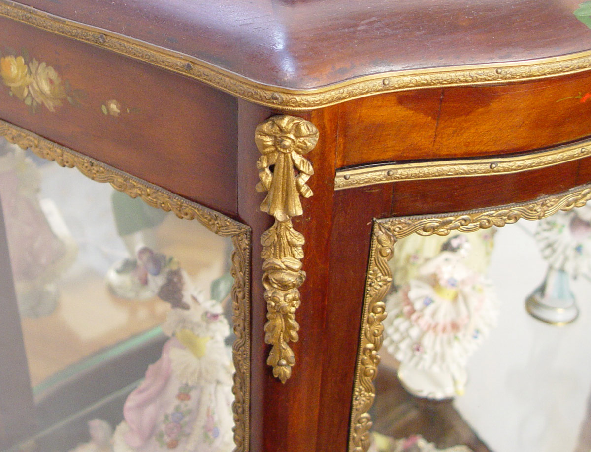 ORMOLU AND PAINT DECORATED FRENCH VITRINE: Early 20th Century Display cabinet with bowed glass front. Mirror back interior with glass shelves. Measures 34 1/2'' high x 37'' wide x 20'' deep.