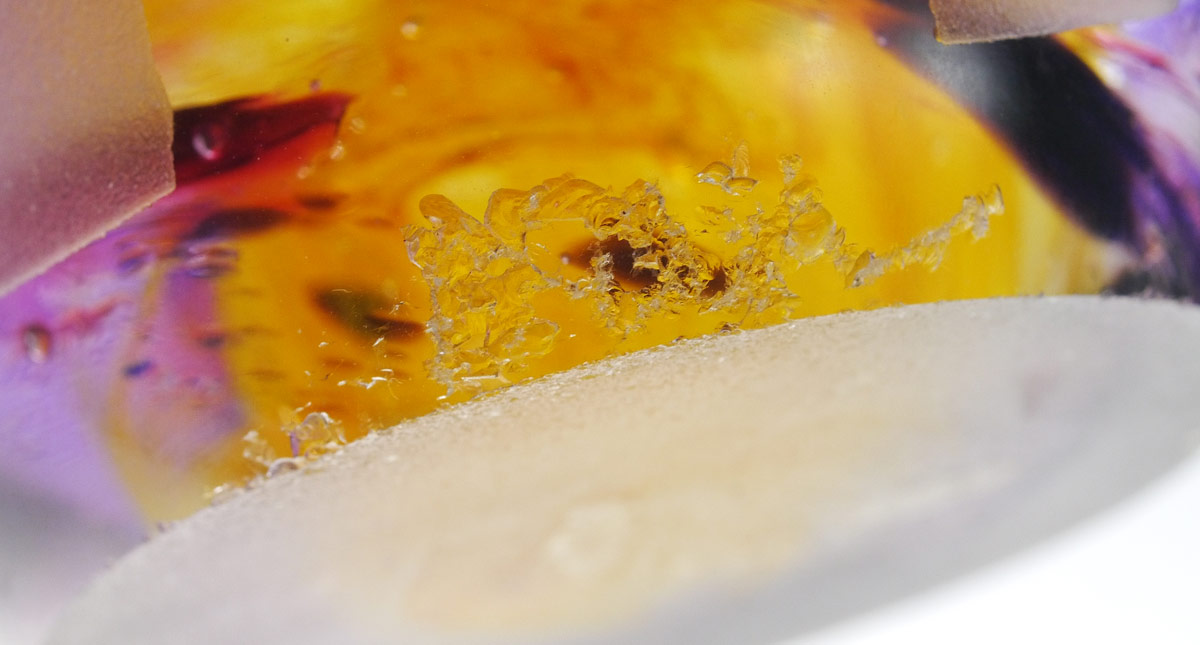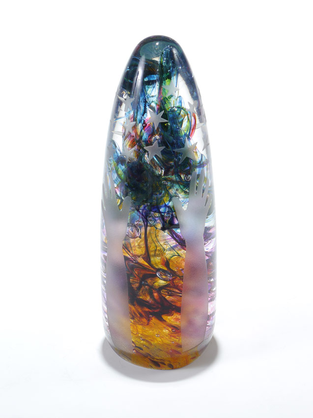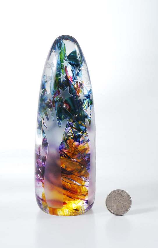 DUNCAN MCCLELLAN REACH FOR THE STARS PAPERWEIGHT: With multi hued internal swirls, etched glass hands and arms with stars. Nearly illegibly signed at base. 6 1/2'' h.