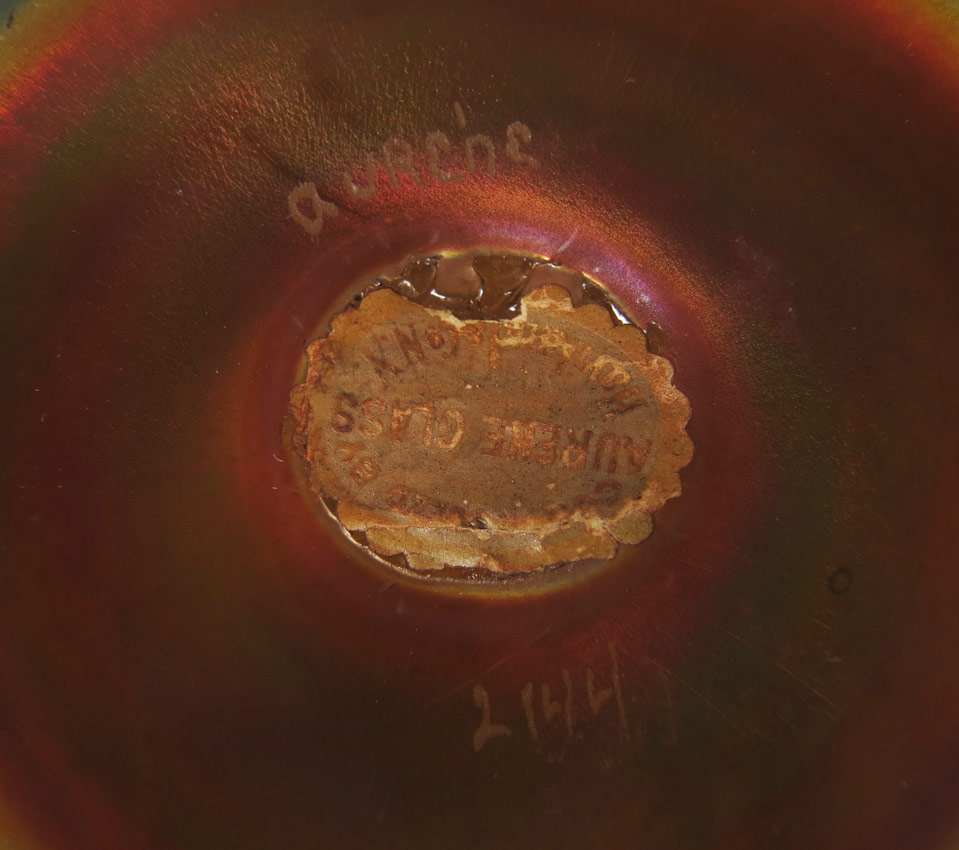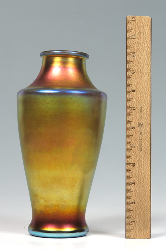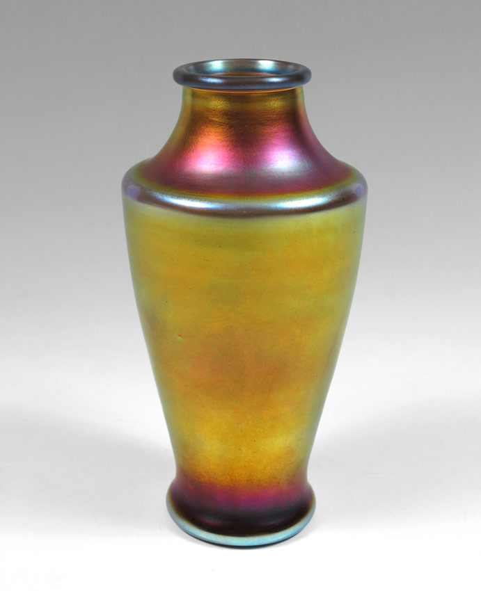 STEUBEN ART GLASS GOLD AURENE VASE: Shape 2144. Signed Aurene and paper label. Height 10 3/4''. Diameter at the widest, 5''.