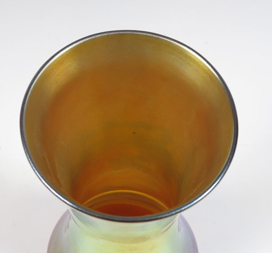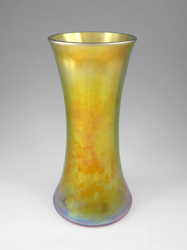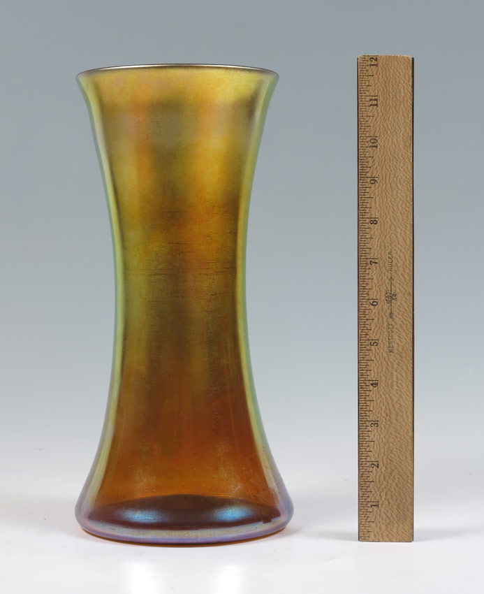 RARE 12'' STEUBEN AURENE FOR HAVILAND VASE: Ca. 1910-1915. Gold Aurene. Steuben and nearly illegible Haviland & Co. stamp on base. 11 3/4'' h. x 5 3/4'' base dia.