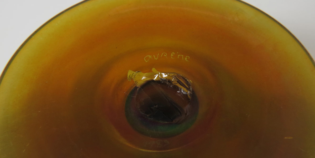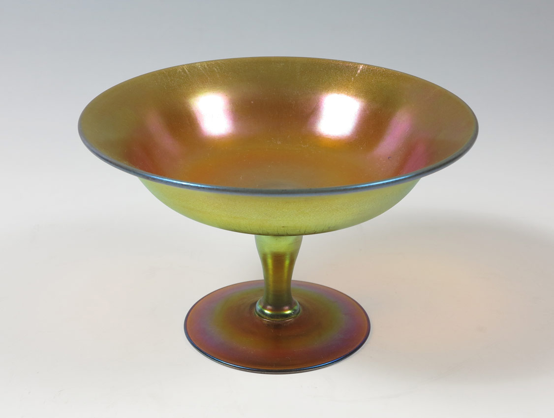 STEUBEN GOLD AURENE ART GLASS COMPOTE: Signed ''Aurene'' and numbered 1983 5'' h. x 8 1/8''.