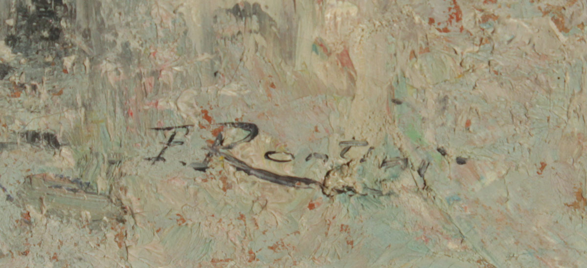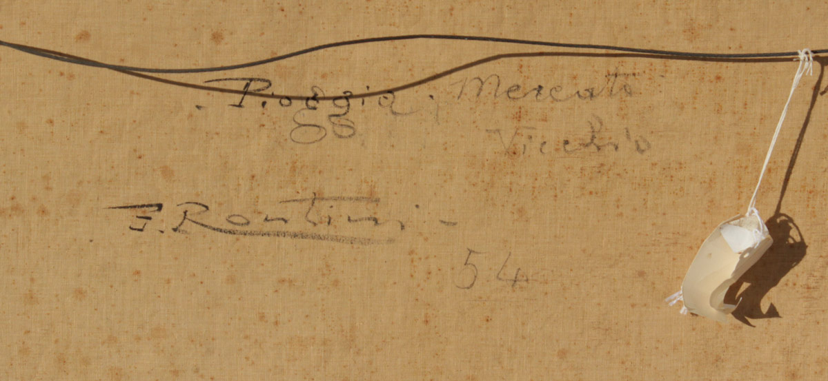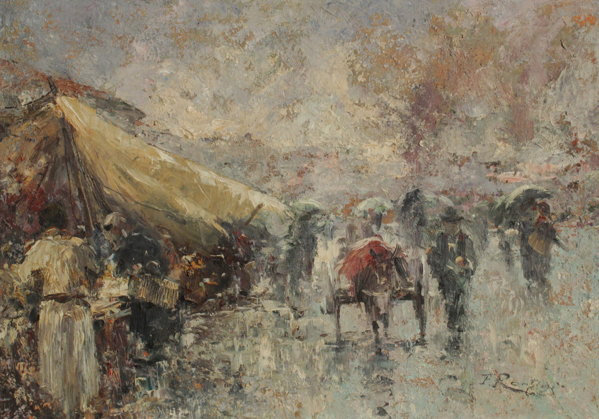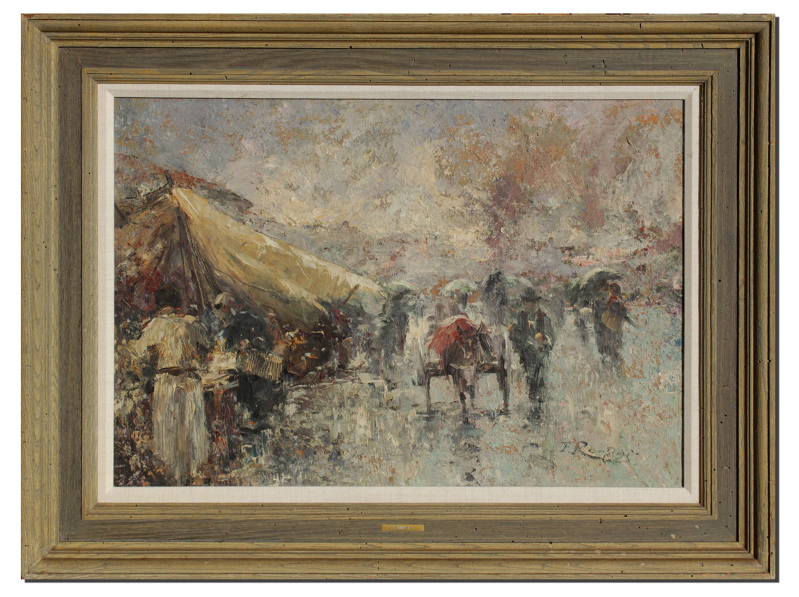 RONTINI, Ferruccio, (Italian, 1893-1964): ''Pioggia Mercato Ticcho?'', Oil/Canvas, 23'' x 33 1/4'', signed lower right, signed and titled verso, dated '54, framed with wear 32 1/2'' x 42 1/2''.