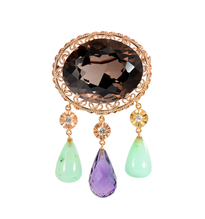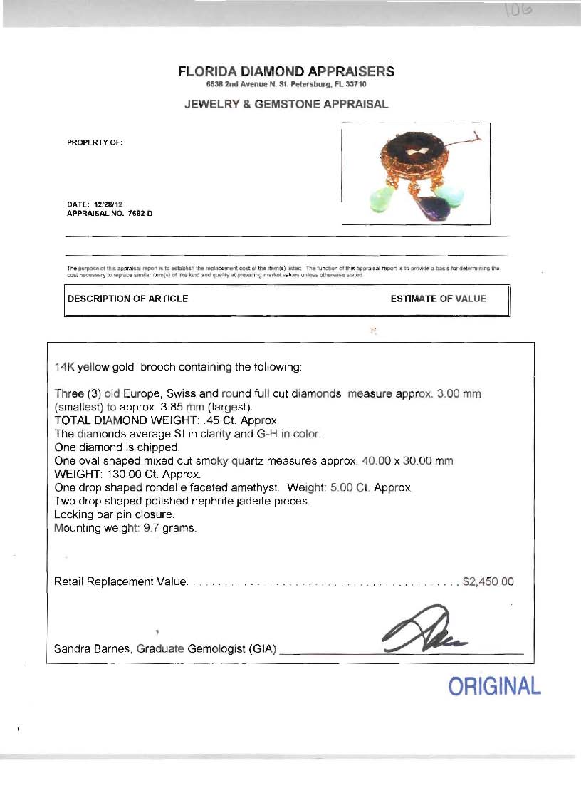1930's QUARTZ, JADEITE & AMETHYST BROOCH: An oval shaped mixed cut smoky quartz framed in 14K yellow gold filigree. Suspended are three gold flowers, each centered by a Old Euro, Swiss or round full cut diamond, all total .45 Ct. From the center flower hangs a 5 Ct drop shaped rondelle faceted amethyst. At the sides are two drop shaped polished nephrite jadeite pieces. Locking pin closure. Mounting weight: 9.7 grams. Length: 2.78''. Width: 2''. Sold with current Florida Diamond Appraisers GIA graduates appraisal for $2,450.