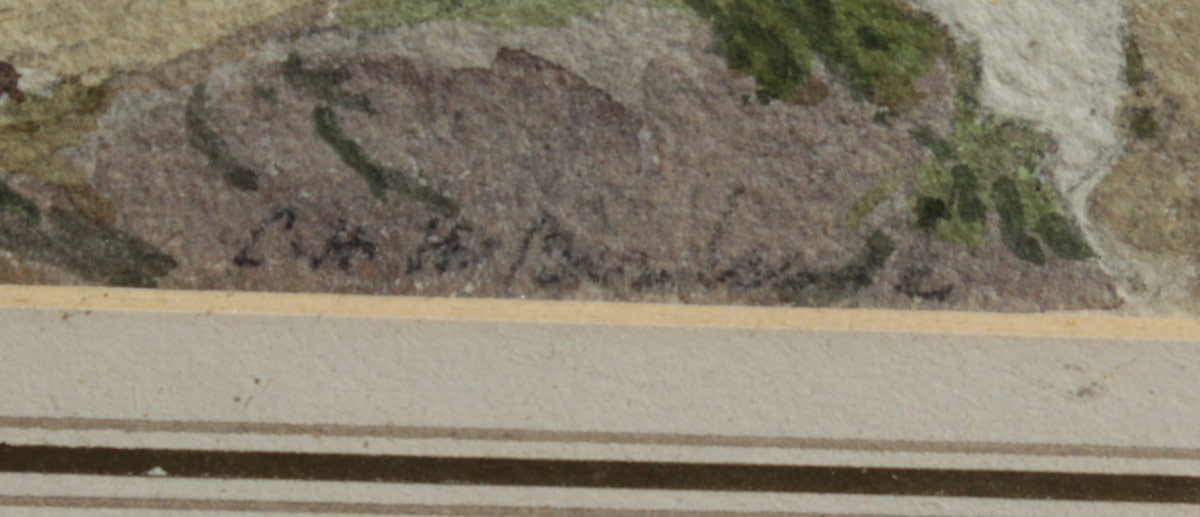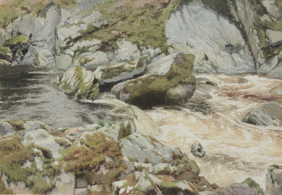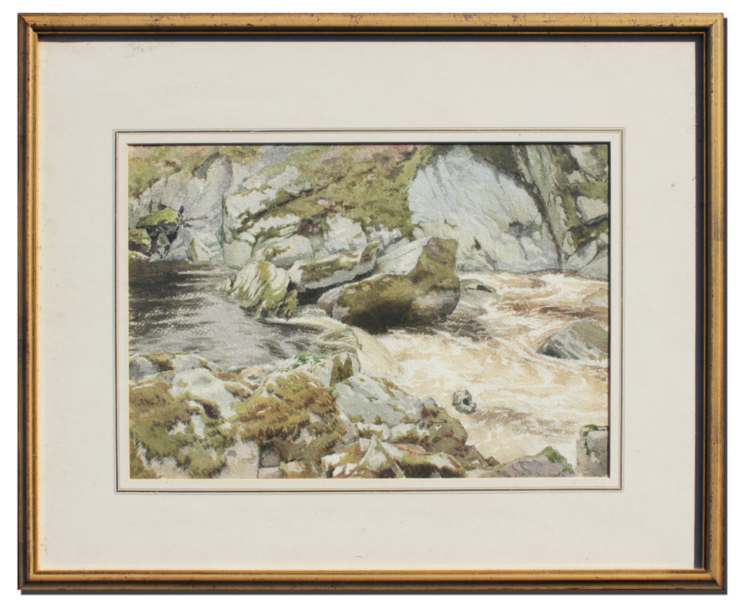 BURLEIGH, Charles H. H., (British, 1875-1956): Roaring Brook, Watercolor, Sight size 9 3/4'' x 14 1/2'', signed in pencil lower right, old typewritten label affixed verso, encased in gilded frame with wear, 17 1/2'' x 21 1/2''.