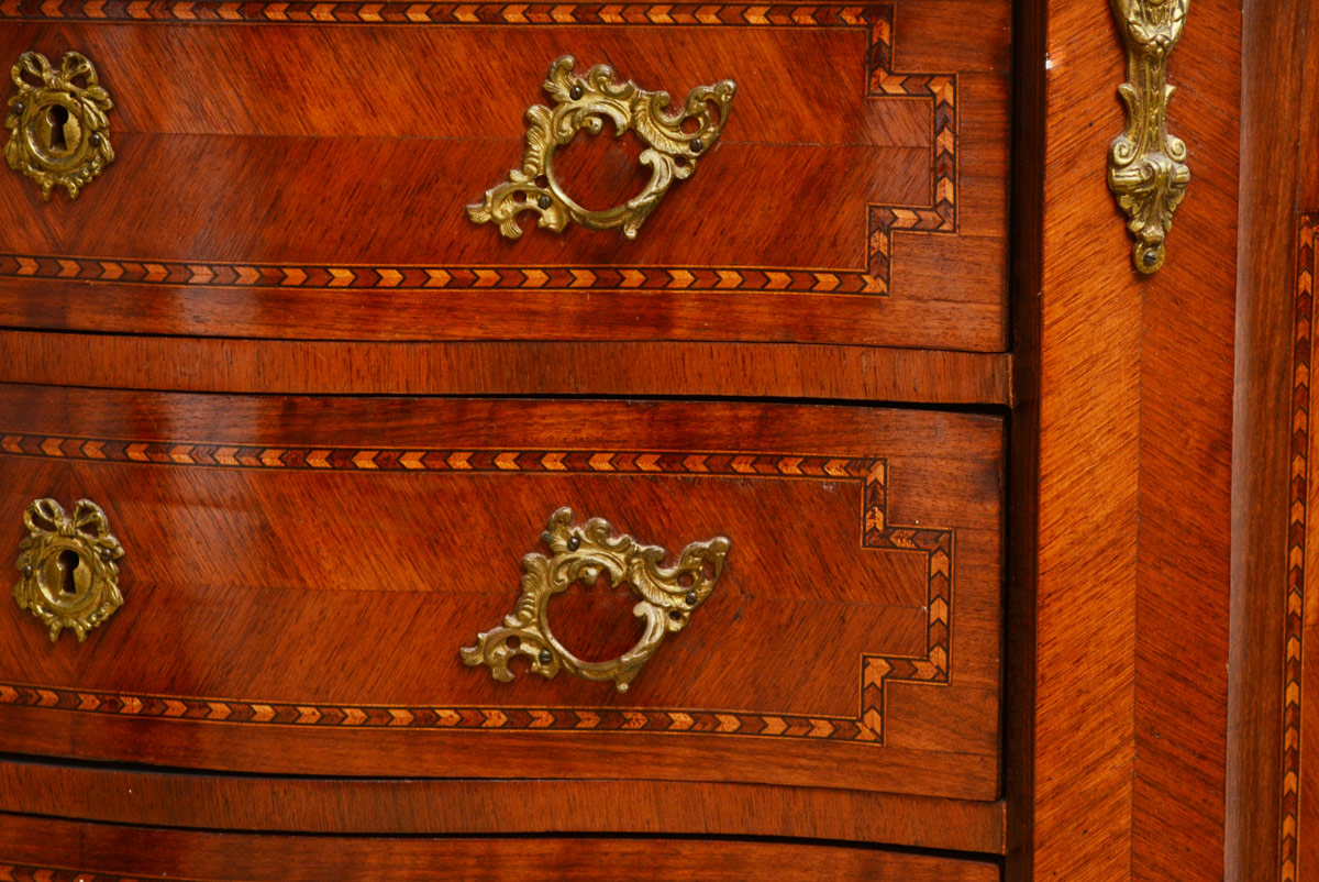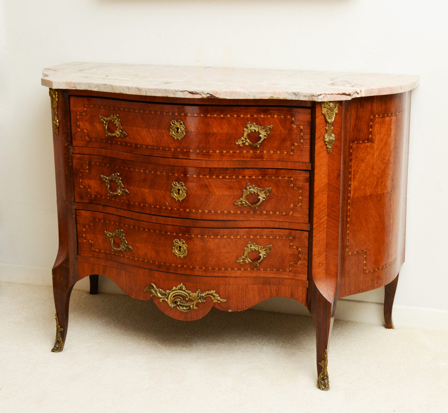 FRENCH LOUIS XV STYLE 3 DRAWER ORMOLU MOUNTED COMMODE: Inlaid 3 drawer front with ormolu hardware, front corners with applied ormolu decoration. Serpentine sides with inlay. Measures 31 3/4'' h. x 43 1/2'' x 20''. Keys in office.
