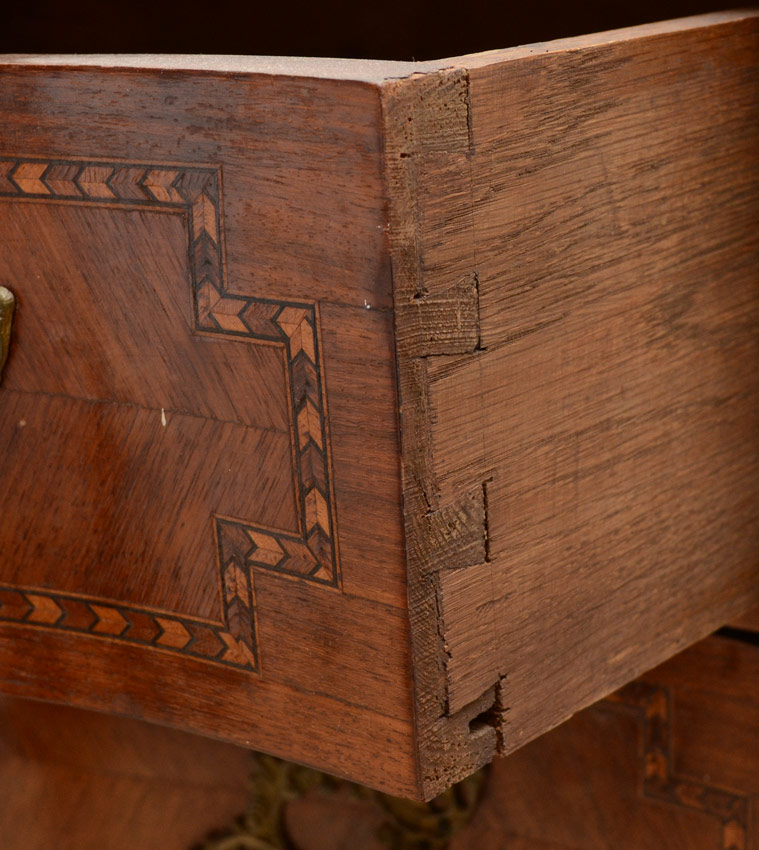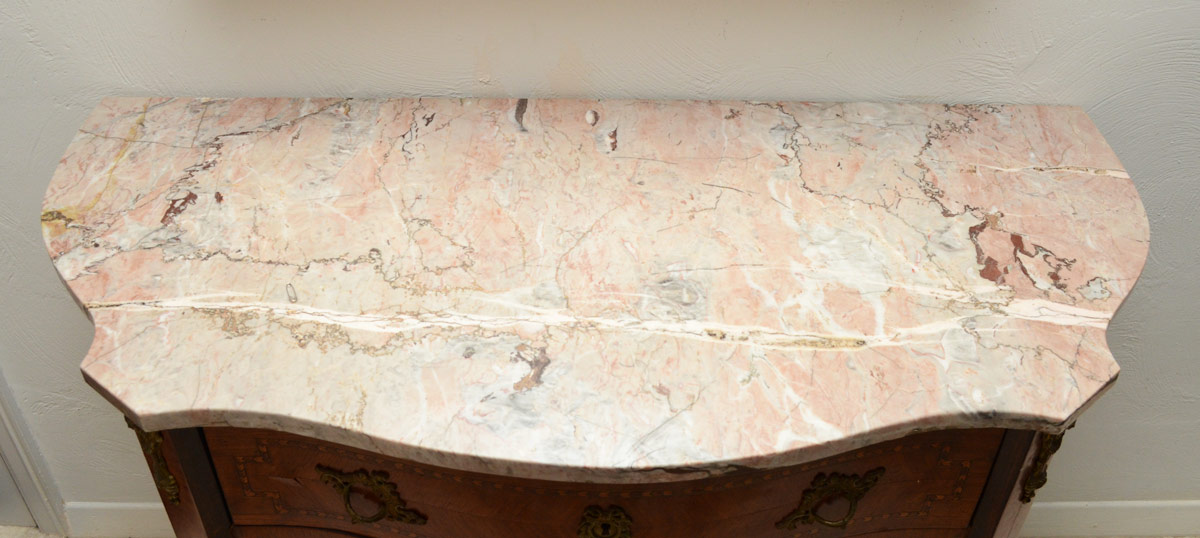CONDITION: Please note that the separation of veneer from sides is covered by the marble top and not apparent from general viewing. Marble top has broken at sight of old repairs, we have the pieces.