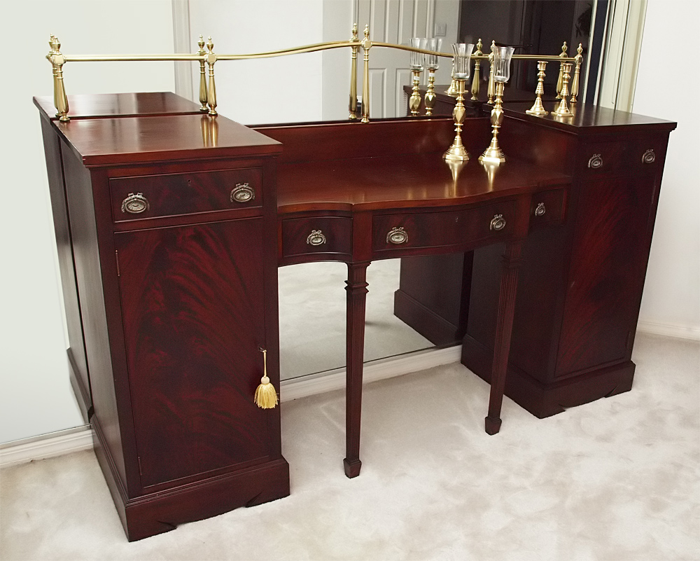 19TH C. ADAMS STYLE FLAME GRAIN MAHOGANY SIDEBOARD: Shaped brass rail, center section with 3 drawers over carved legs. Surmounted on either side by single drawer over single door with 2 interior shelves. 55'' h. x 78 1/4'' x 24''