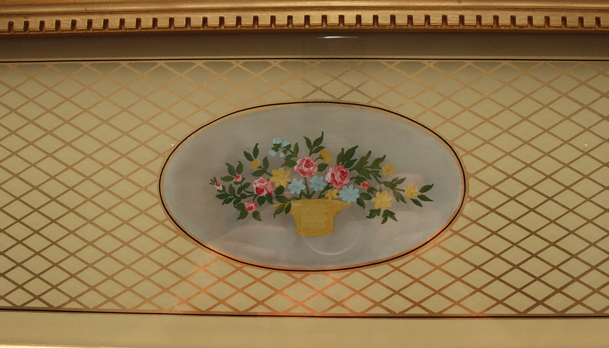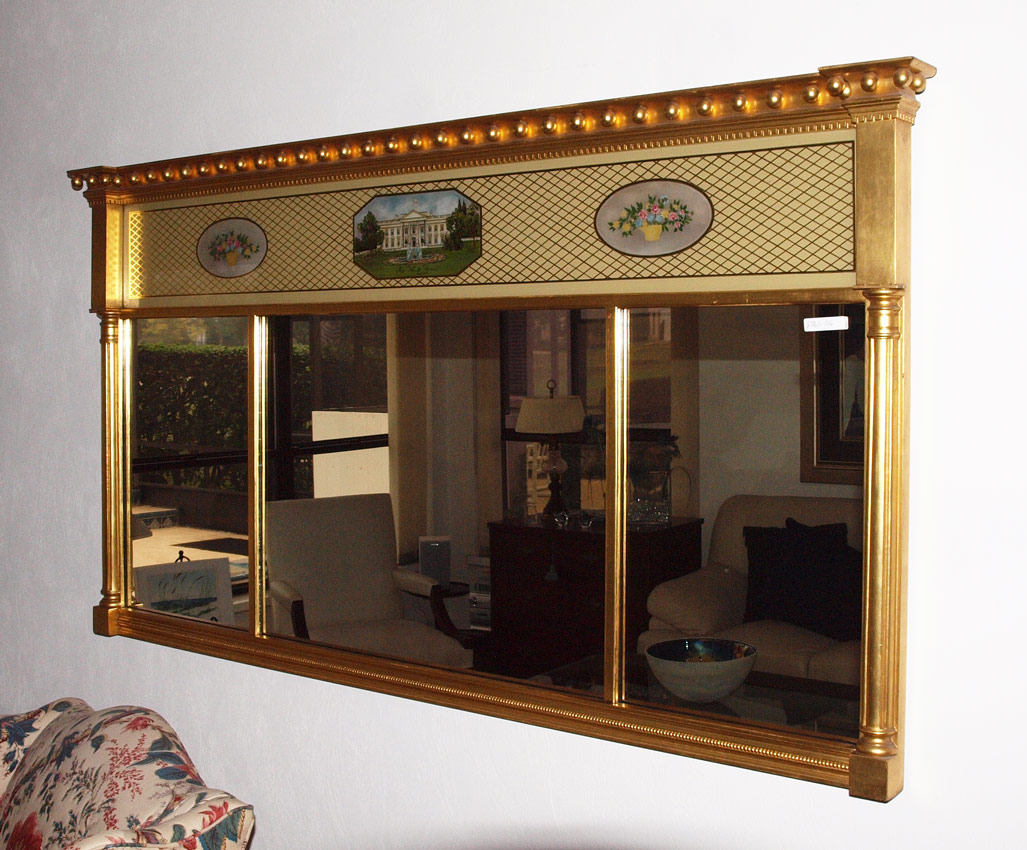 ADAM STYLE GOLD LEAF OVER MANTLE MIRROR: Gold gilt frame with ball and half column decoration. Top section reverse painted with scene of the White House and baskets of flowers in medallions. 3 panel mirror lower section. 28 1/4'' h. x 53'' x 3''.