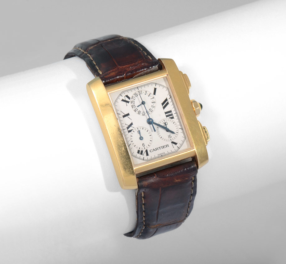 18K CARTIER TANK FRANCAISE CHRONOGRAPH WATCH: 18K yellow gold watch with original brown crocodile band. Signed on case, dial and 18K buckle. MG263702. Length: 9''.