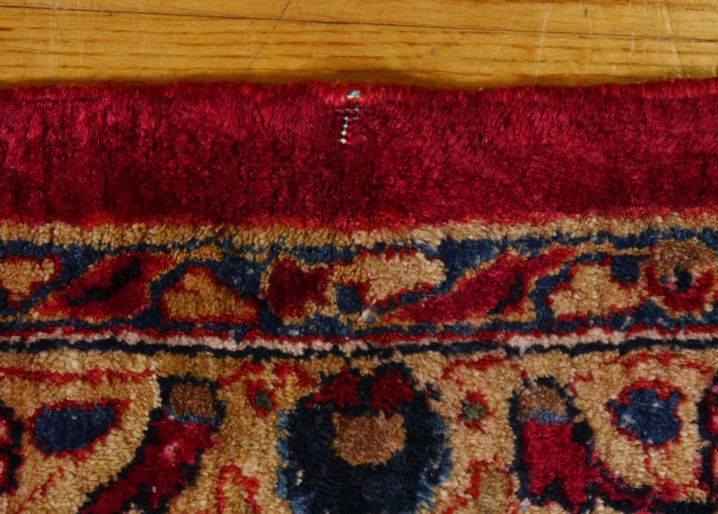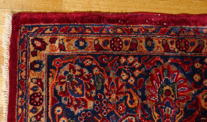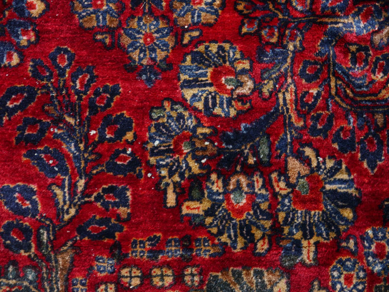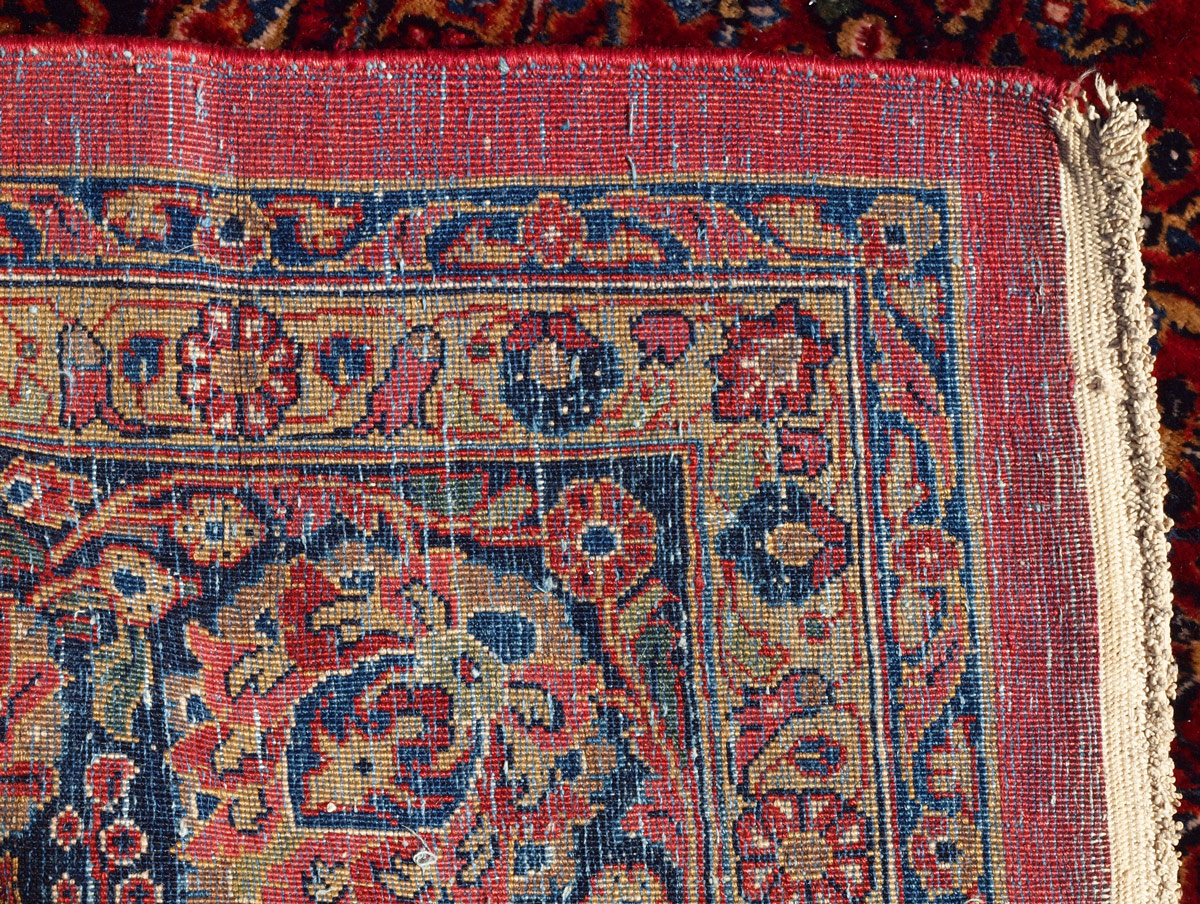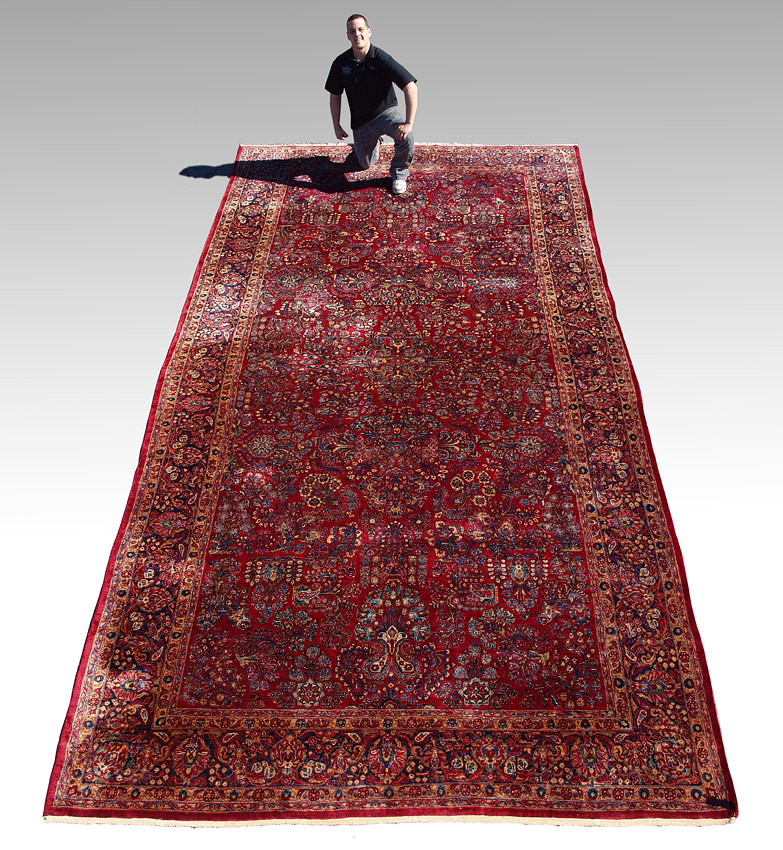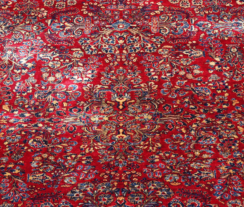 SEMI-ANTIQUE PERSIAN SAROUK HAND KNOTTED WOOL RUG, 10' x 19': This beautiful, meaty, Persian rug was woven with a lustrous wool in one of the traditional patterns seen in Persian Sarouks. The red ground is covered with sprays of flowers done in colors of shades of blue, red, white, yellow, beige, and peach. This is a large, almost palace sized rug that is in excellent condition. It would be at home in the finest of estates because of its quality and beauty. Condition is good.