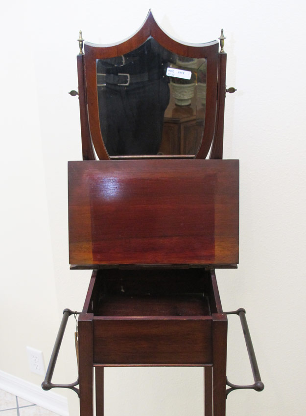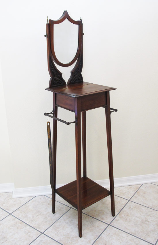 ART NOUVEAU TRANSITIONAL SHAVING STAND: Beveled glass mirror in a shield form, with carved wood supports and 2 brass finials. Hinged top, legs with iron towel bars. Lower shelf. 57 1/4'' h. x 16 1/2'' x 13 1/2''.