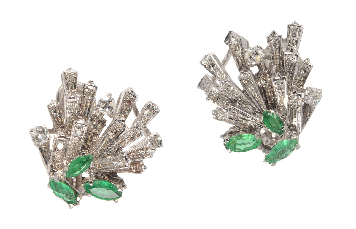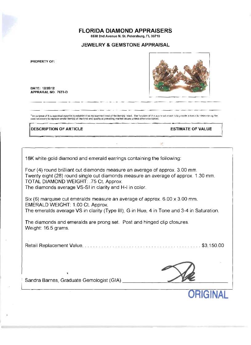 18K DIAMOND & EMERALD EARRINGS: 18K white gold earrings of 4 round brilliant cut diamonds (3mm) and 28 round single cut diamonds totaling approx. .75 Ct., averaging VS-SI in clarity and H-I in color. The six marquise emeralds total approx. 1 Ct., VS clarity. Prong set. Post and hinge clip closures. Weight: 16.5 grams. Sold with current Florida Diamond Appraisers GIA graduates appraisal for $3,150.