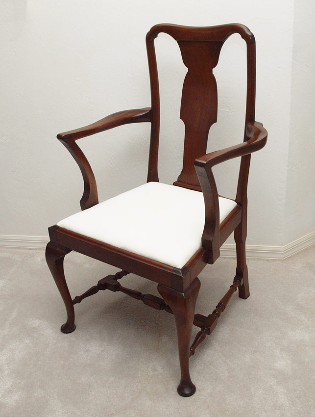SET OF 6 QUEEN ANNE DINING CHAIRS: Shaped back with cabriole front legs, turned stretchers. 2 arm chairs with white cushions 42'' h. x 25 1/4'' x 22 1/4'', 4 side chairs with foliate upholstery.