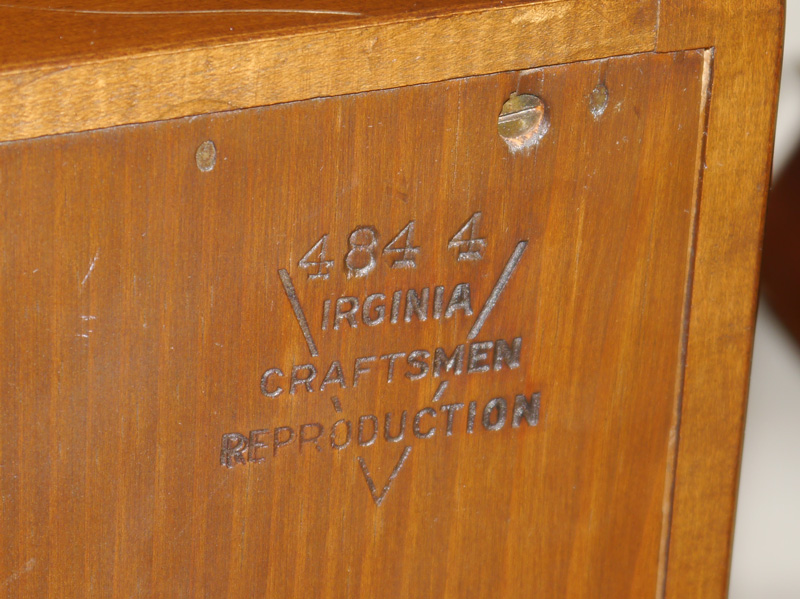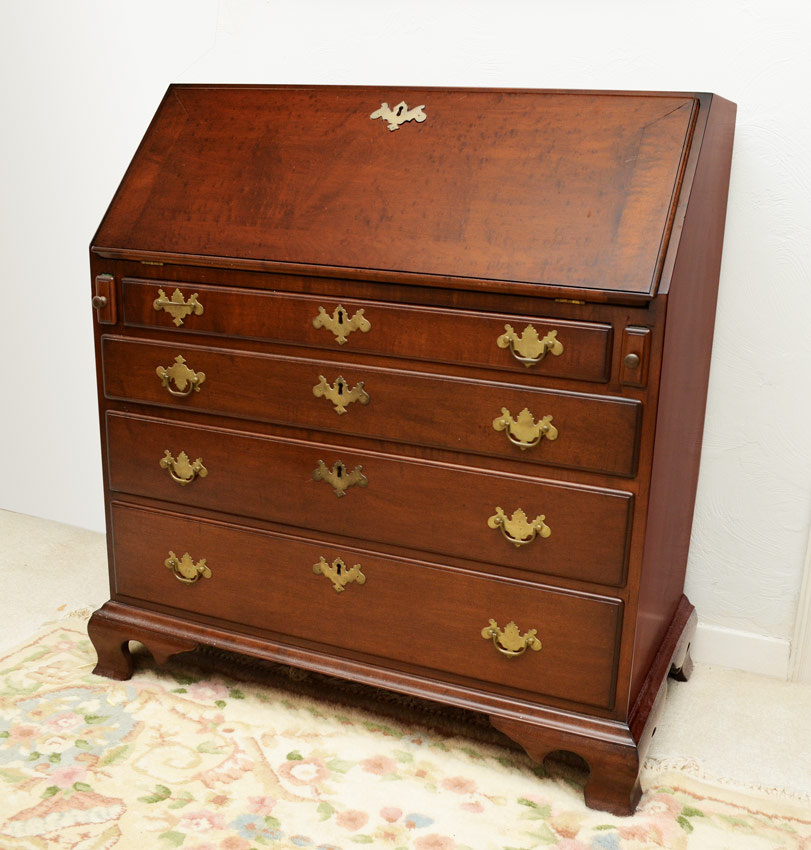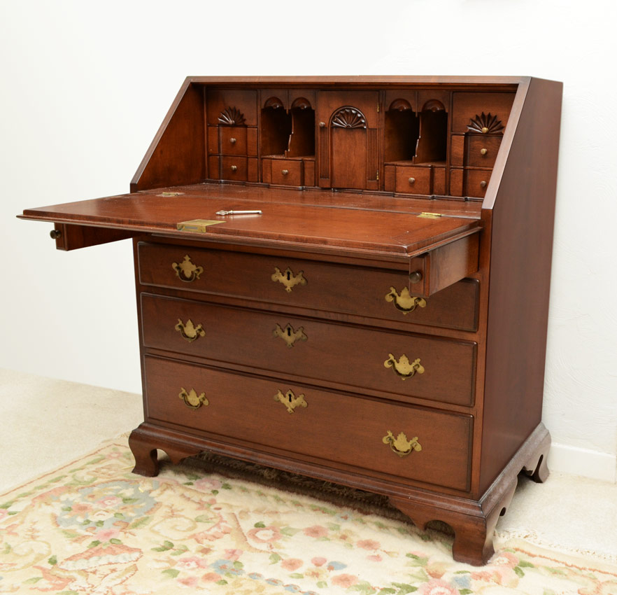 VIRGINIA CRAFTSMEN BURL CHIPPENDALE STYLE DESK: Burl wood fall front opens to central door with carved decoration, shaped drawers and pigeon holes. 4 graduated drawers, brass pulls and hardware, on shaped feet. Marked on back Virginia Craftsmen Reproduction. 38 1/2'' h. x 34'' x 19 1/4''.