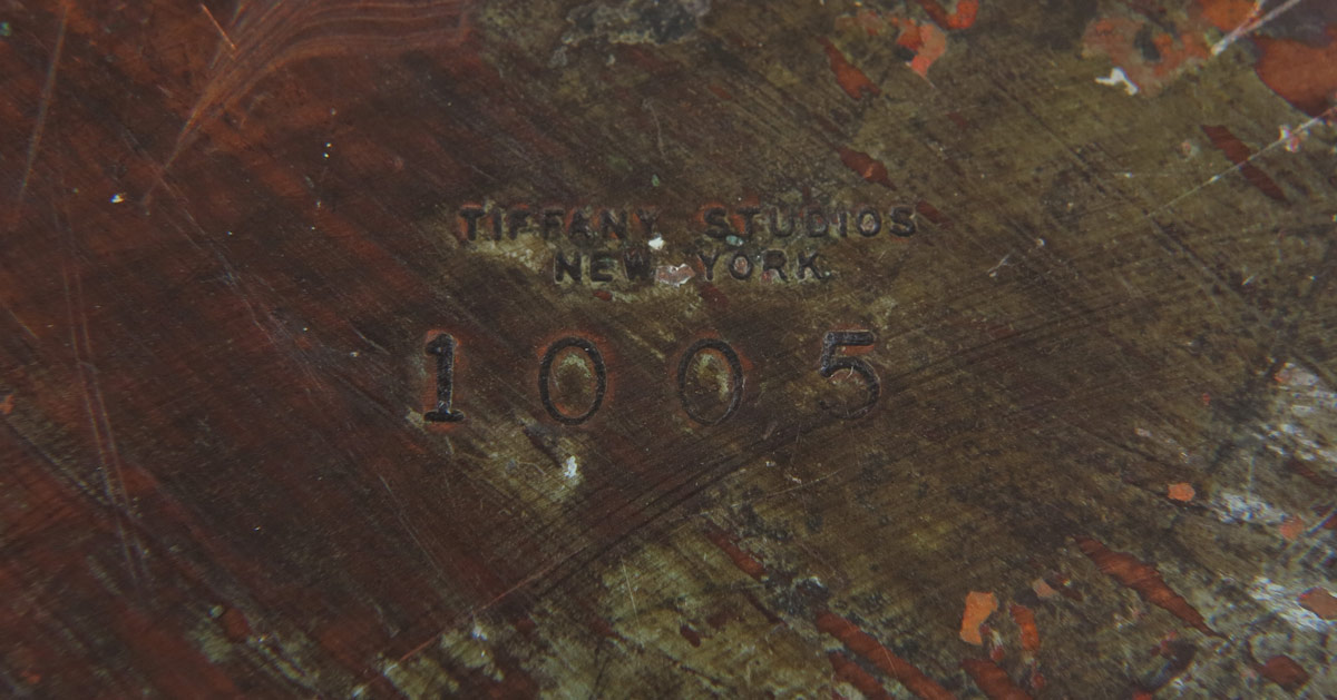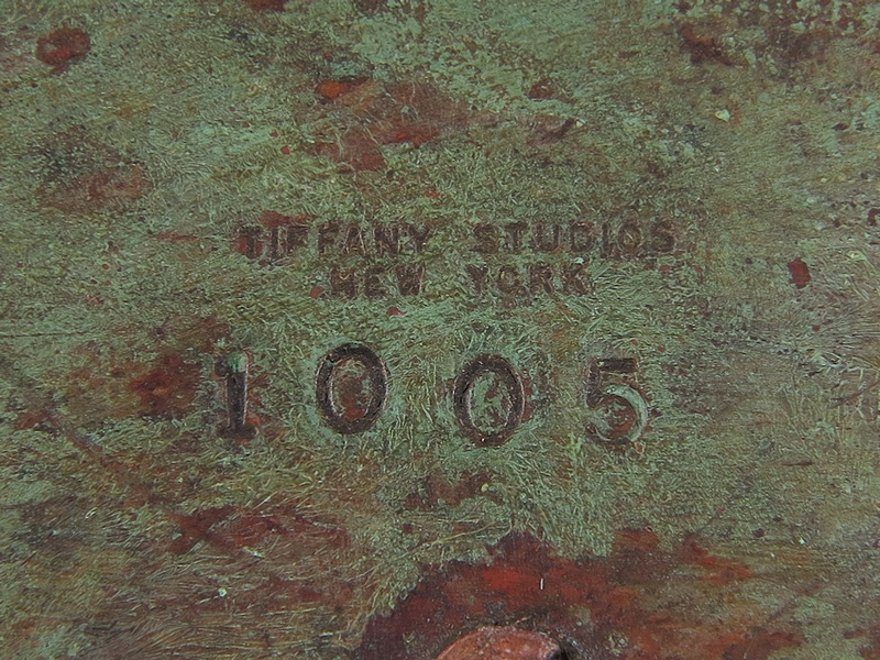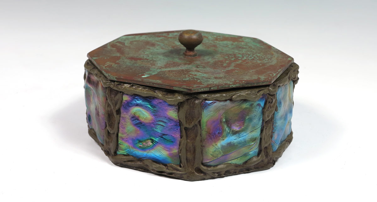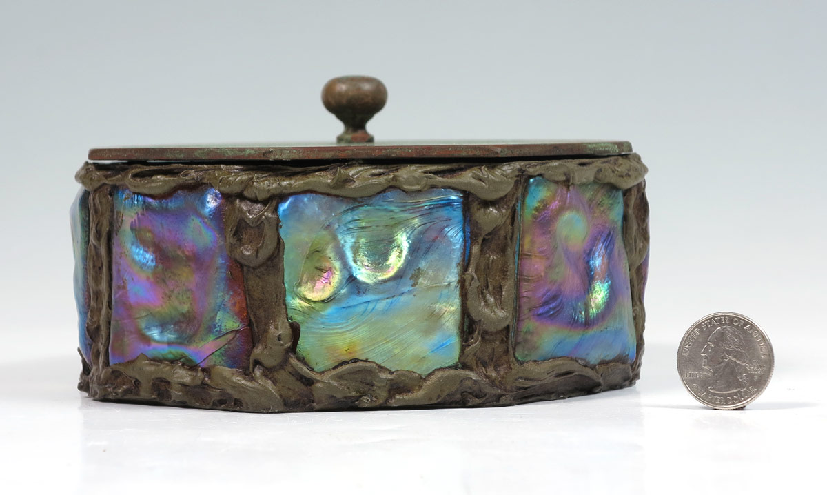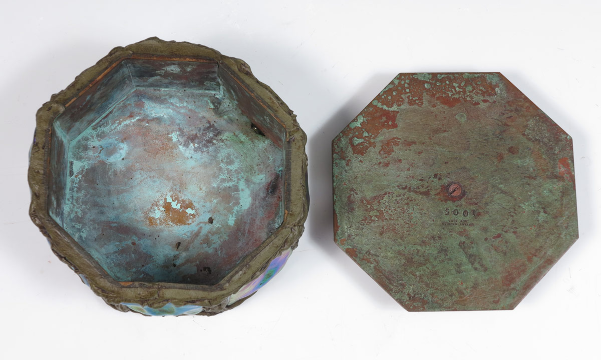 TIFFANY STUDIOS BRONZE AND GLASS COVERED BOX: Octagonal shape set with 8 iridescent glass panels. Cover and box with impressed ''Tiffany Studios New York 1005''. Measures approx. 2 1/2'' height x 6'' dia. This box may or may not be Tiffany Studios.