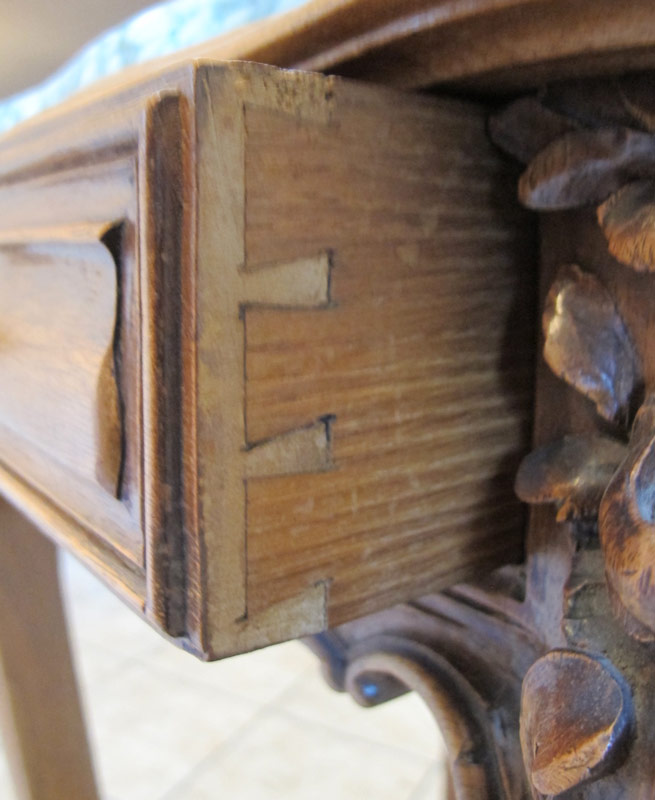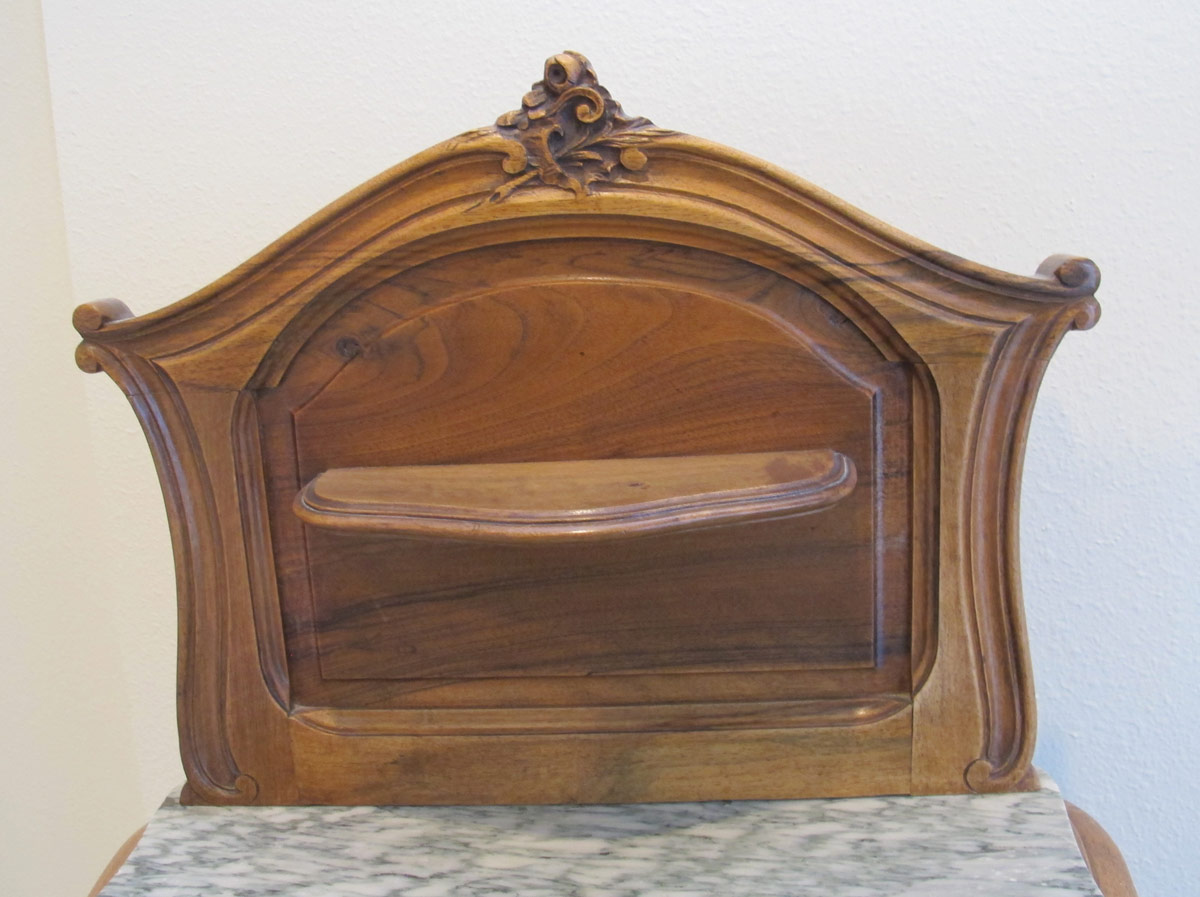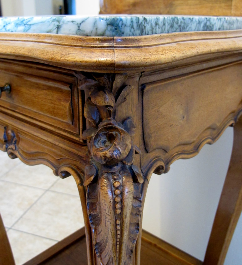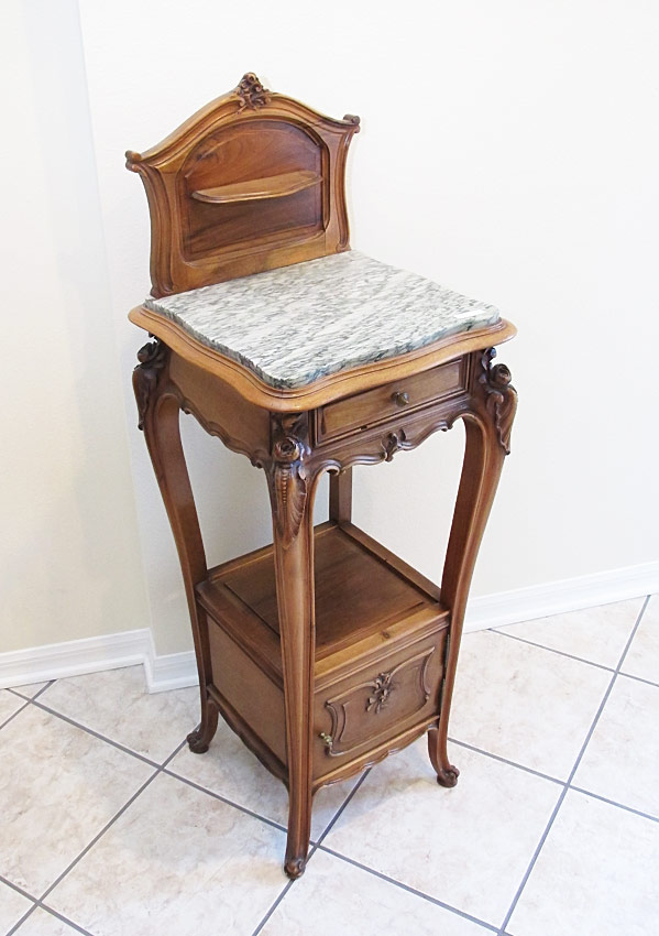 TALL FRENCH WALNUT MARBLE TOP SIDE TABLE: Carved and shaped back splash with shelf over variegated green marble top. Base with single drawer, carved and shaped legs with lower door. Measures 47 1/2'' h. x 16'' x 16''.