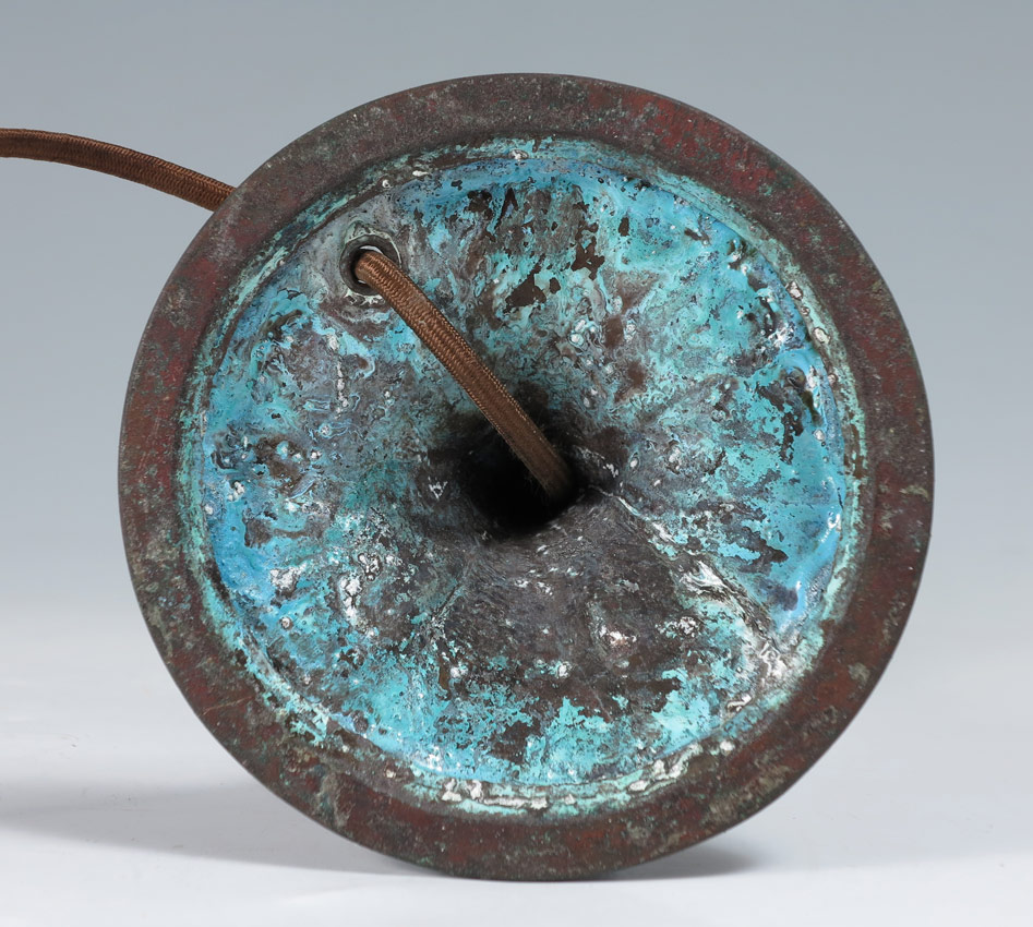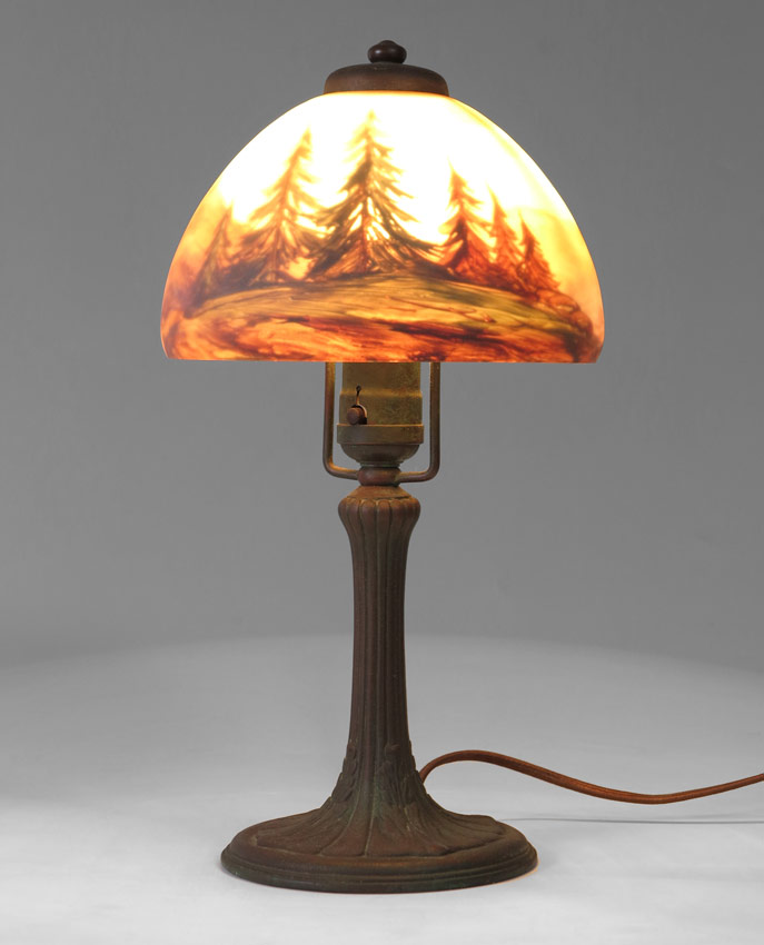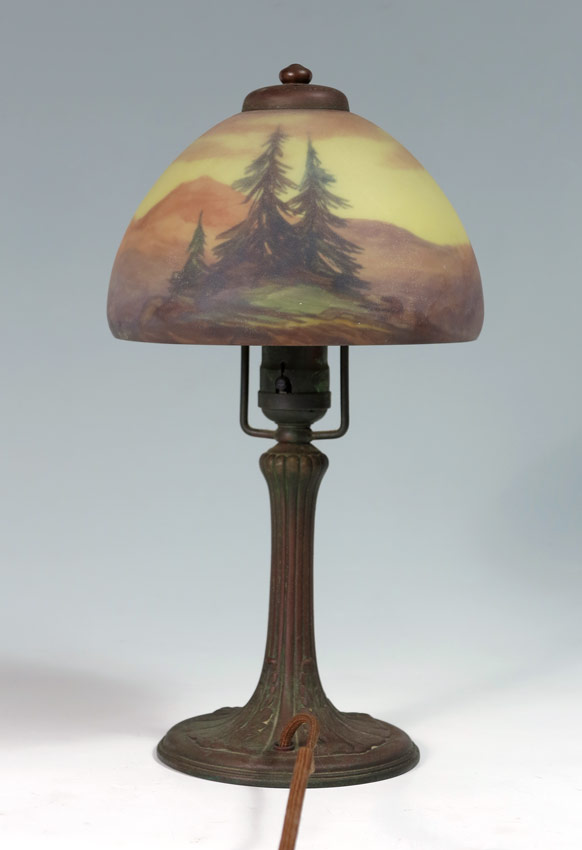 SIGNED HANDEL BOUDOIR LAMP: Domed reverse painted shade in a mountainous landscape with trees in the foreground, signed 7155 Handel. Original bronzed metal base, single socket. Measures approx. 13'' tall, the shade 7'' dia.