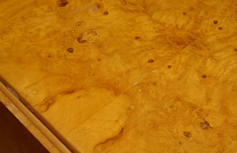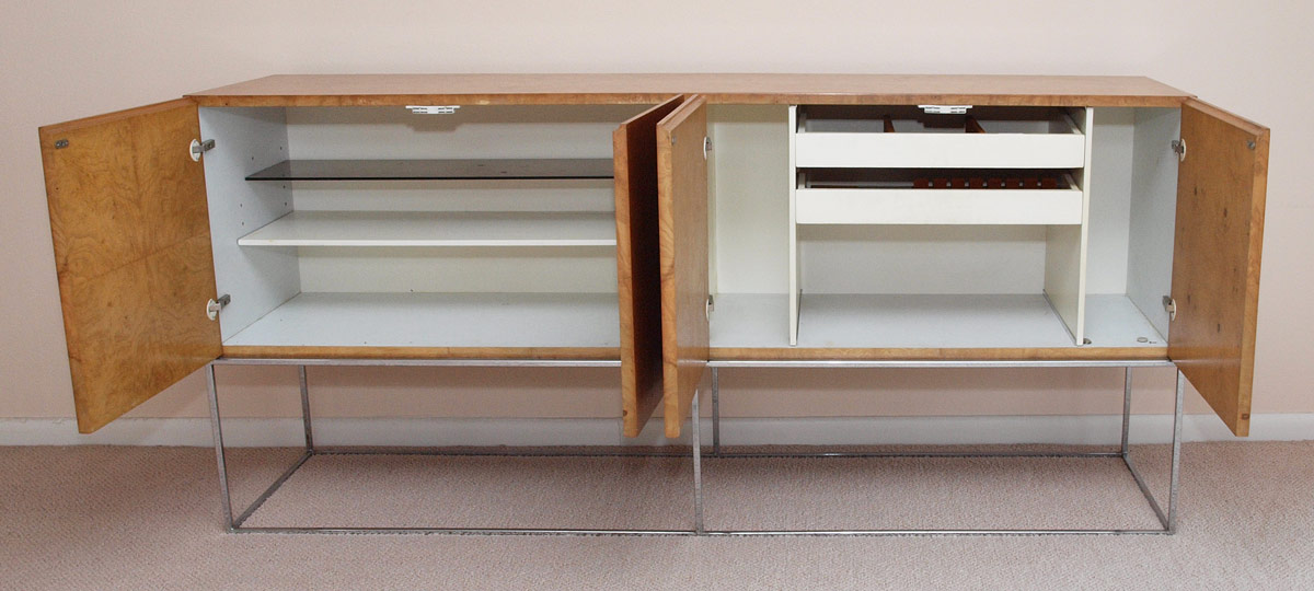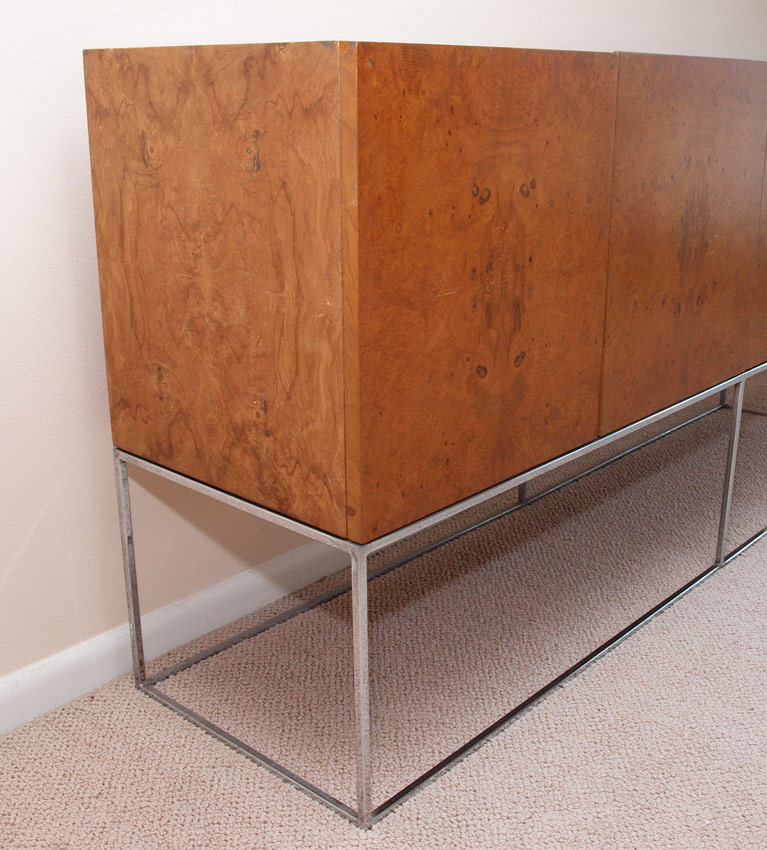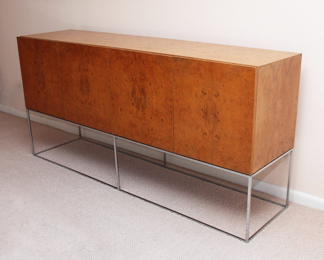 MILO BAUGHMAN FOR THAYER COGGINS BURLWOOD CREDENZA: Burl veneer top section with 4 doors on polished steel base. 34 1/2'' h. x 72'' x 18''.