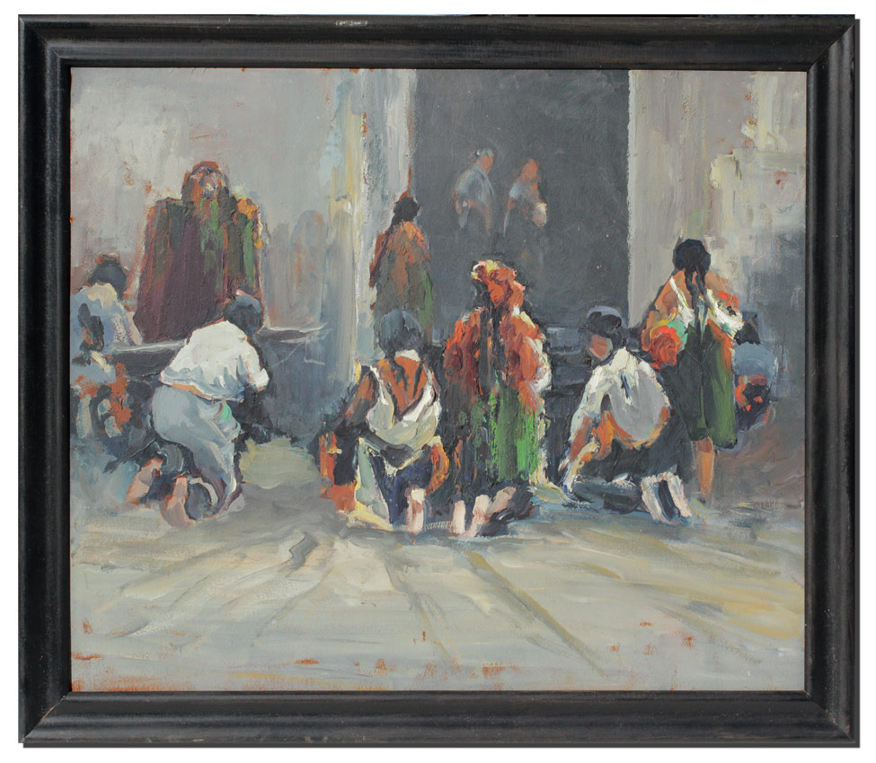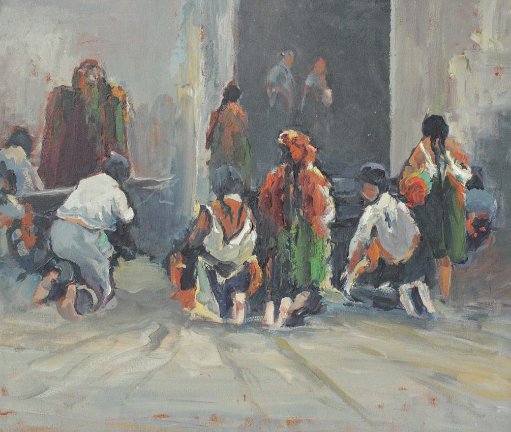 GOOD UNSIGNED MIDDLE EASTERN STREET PAINTING: Oil/Board, 24 1/2'' x 29 1/2'', Fixed Figures Kneeling in the Street, illegible inscription verso, dated 1947, encased in black frame with wear 28 1/2'' x 32''.