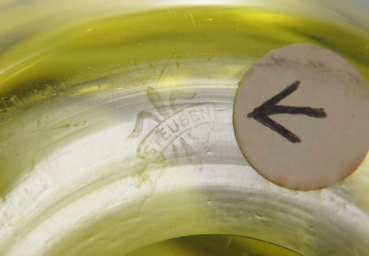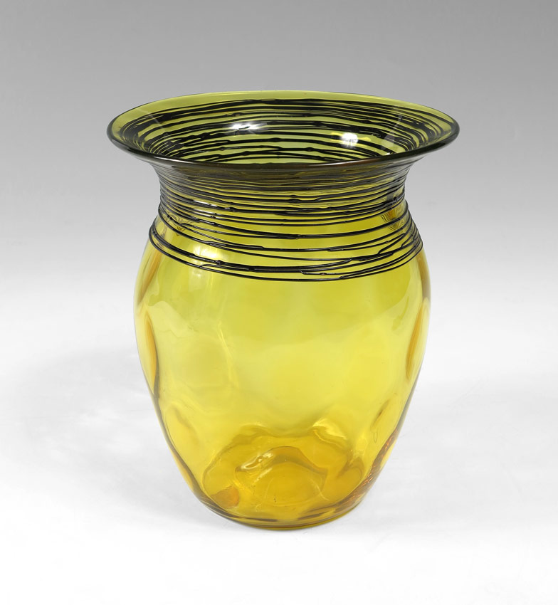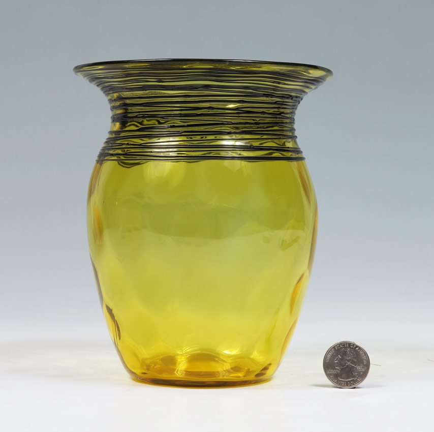 STEUBEN BLACK THREADED AMBER ART GLASS VASE: Dimpled amber glass body with threaded black glass on throat. Fleur-de-li mark. 6 1/2'' h. x 5 1/2''.
