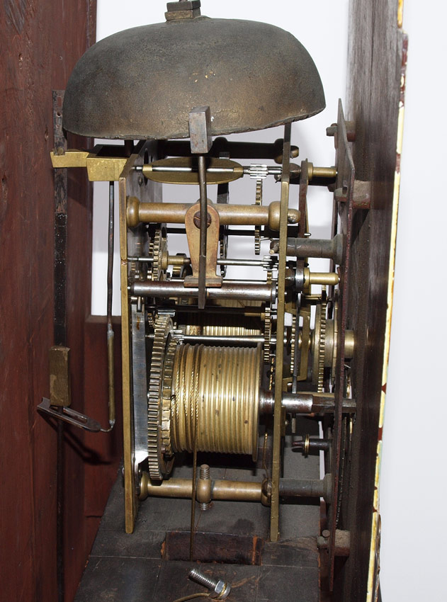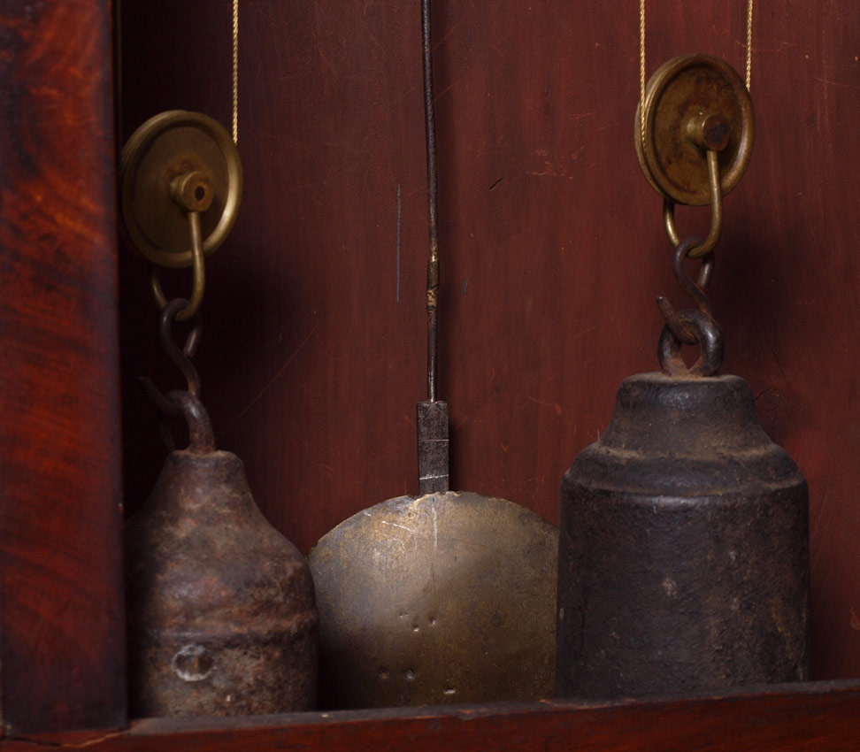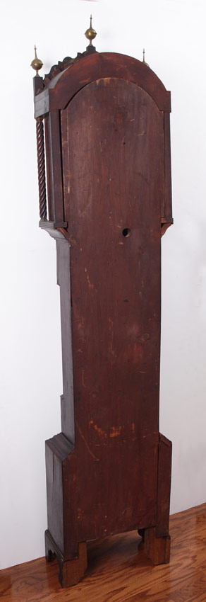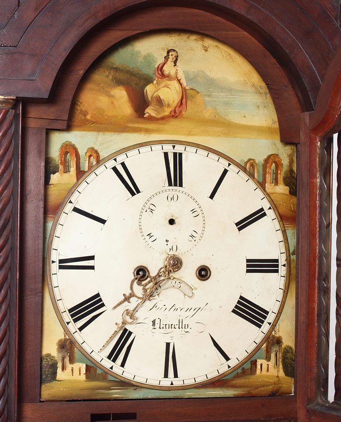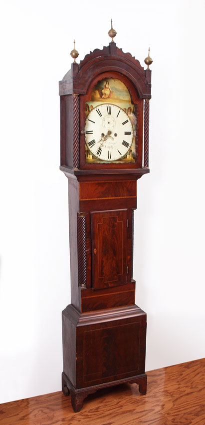 SEBASTIAN FURTWENGLER WELSH LONG CASE CLOCK: Circa mid 19th century, mahogany case, shaped pediment with 3 brass finials. Twist full column supports on bonnet. Flame mahogany panels and string inlay on case. Hand painted metal dial with outdoor genre scenes, partially signed S. Furtwengler, LLanelly. Dial with secondary date and second dials. Measures 87 1/2'' x 19 3/4'' x 9 1/2''.