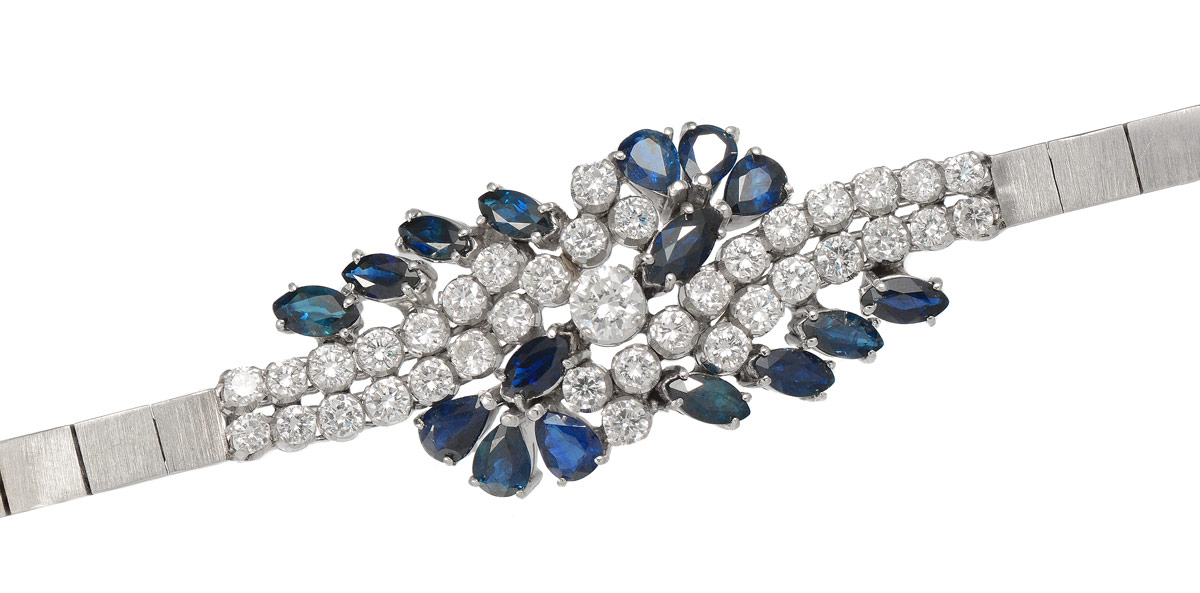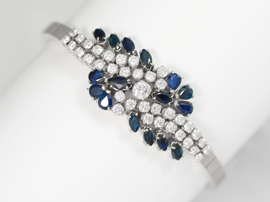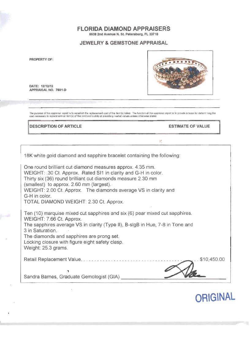 2.30 Ctw DIAMOND & 7.66 Ctw SAPPHIRE BRACELET: 18K white gold flex bracelet of sapphires and diamonds. The center diamond is round brilliant, approx. .30 Ct., SI1 in clarity and G-H color. The remaining 36 round brilliant diamonds total approx. 2 Ct., average VS in clarity and G-H color. The 10 marquise cut sapphires total approx. 7.66 ct, average V in clarity. All stones are prong set. Locking closure with figure eight safety clasp. Length 7.5''. Weight 25.3 grams. Sold with current Florida Diamond Appraisers GIA graduates appraisal for $10,450.