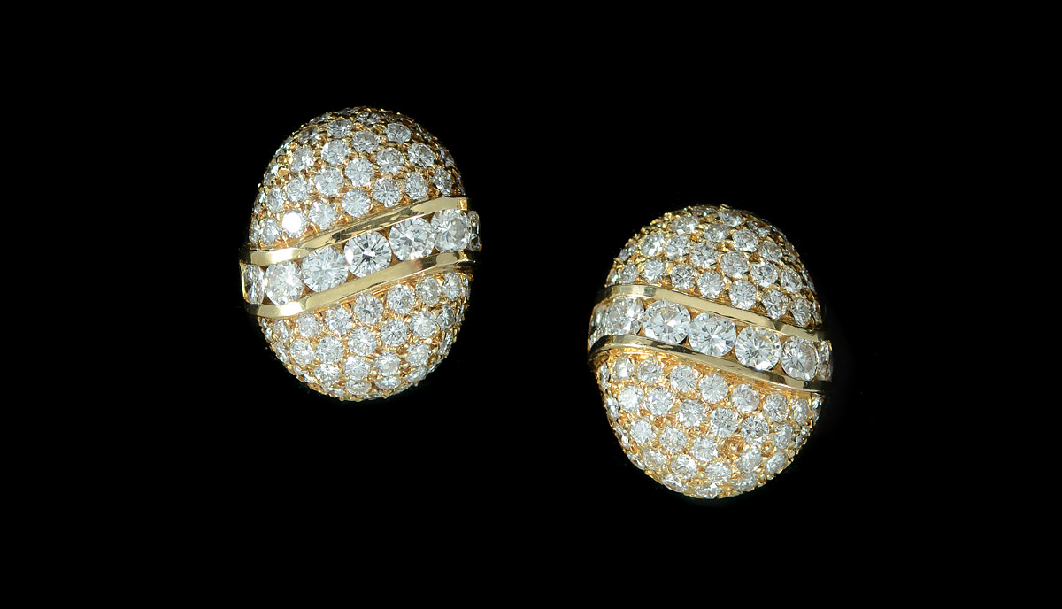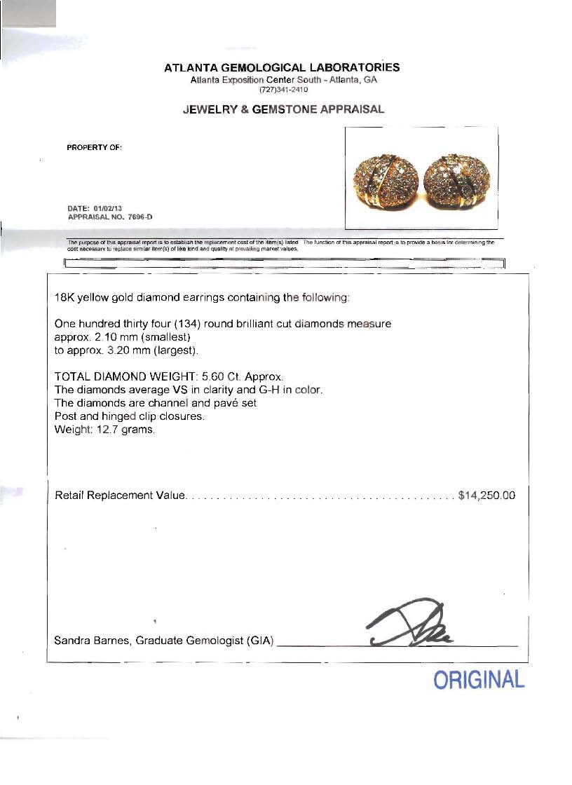 18K DIAMOND EARRINGS: A melee of diamonds in 18K yellow gold. 134 round brilliant diamonds total approx. 5.60 Ct., are rated VS in clarity and G-H color. The bands of larger diamonds are channel set, the others are pave set. Post and nut closure. Length .75''. Weight 12 .7 grams. Sold with current Atlanta Gemological GIA graduates appraisal for $14,250.