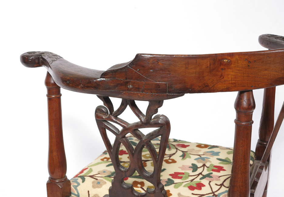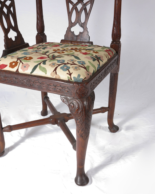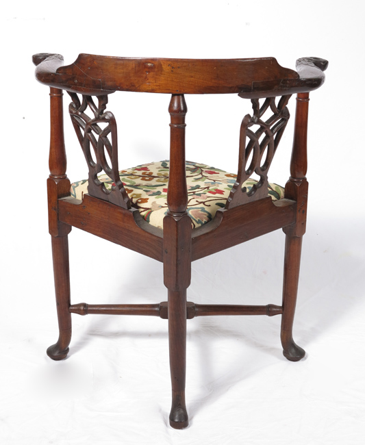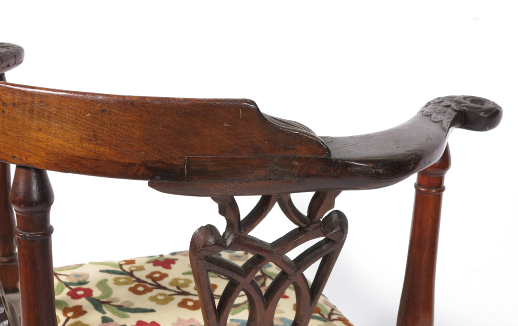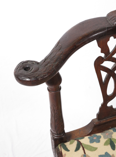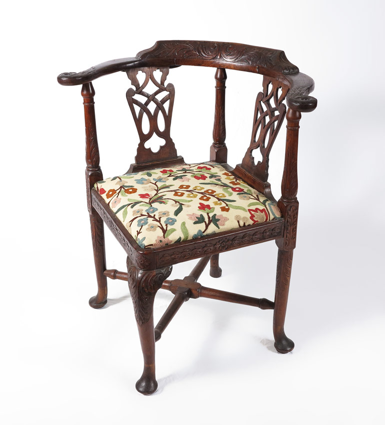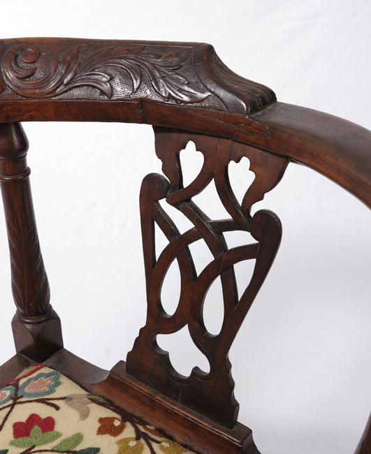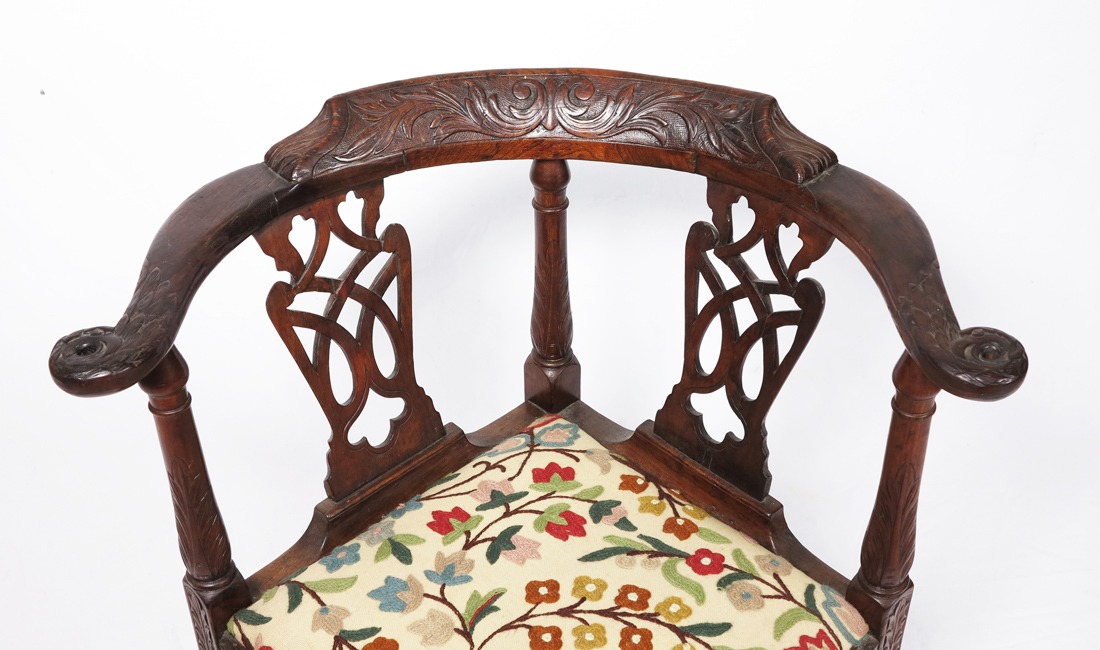 CHIPPENDALE PERIOD CARVED CORNER CHAIR: Carved crest with shaped arms ending in carved figural eagle head hand holds. Carved supports, skirt and knee, ending in pad feet. Pegged construction, cruel work seat. Measure 32 1/2'' h. x 28'' x 25 1/4''.