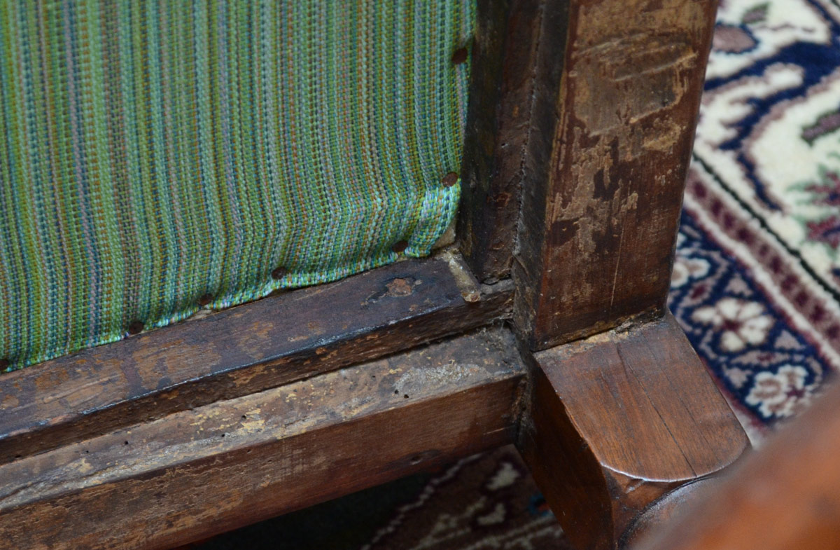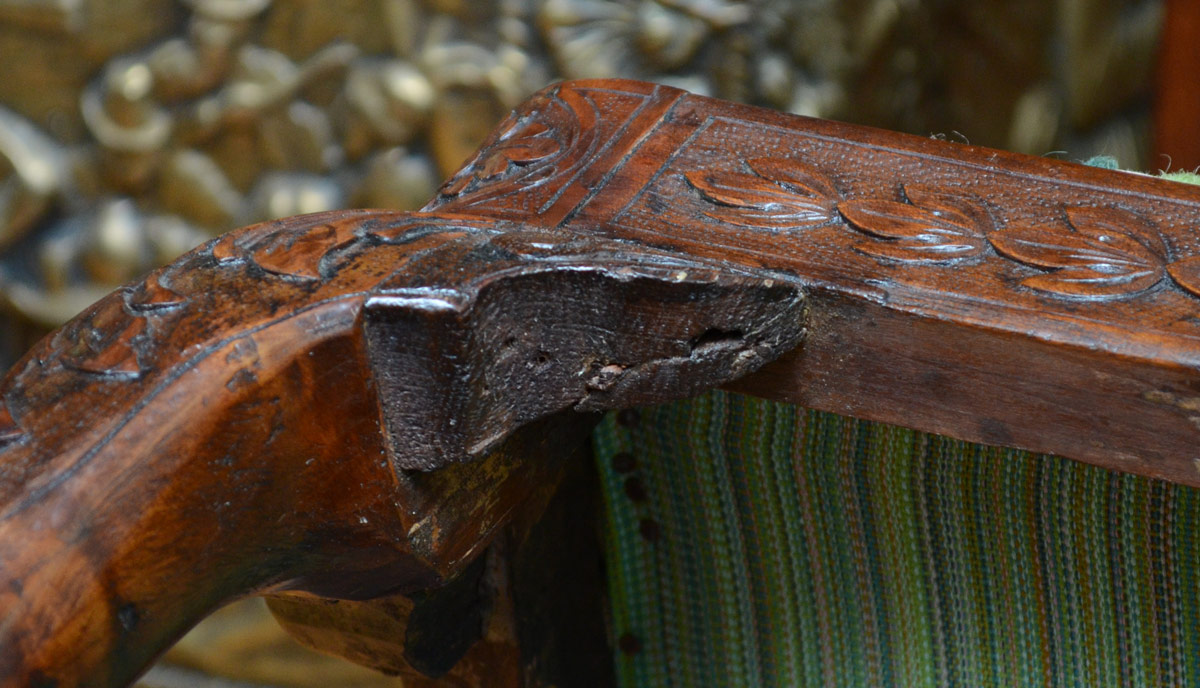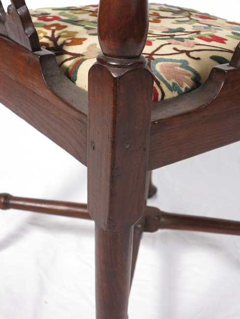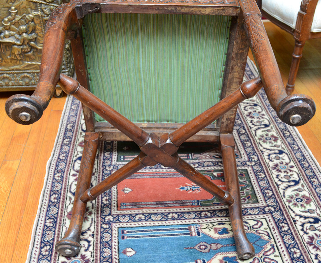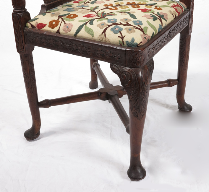 CHIPPENDALE PERIOD CARVED CORNER CHAIR: Carved crest with shaped arms ending in carved figural eagle head hand holds. Carved supports, skirt and knee, ending in pad feet. Pegged construction, cruel work seat. Measure 32 1/2'' h. x 28'' x 25 1/4''.