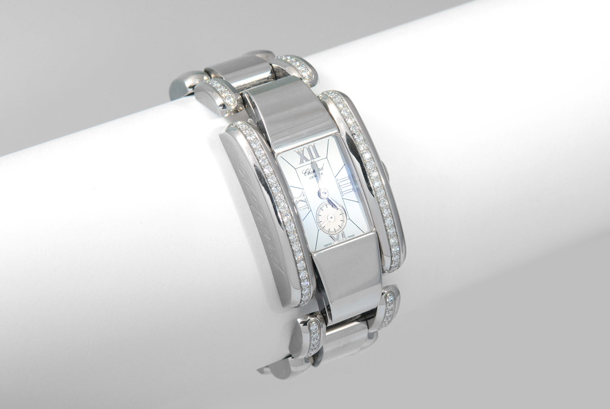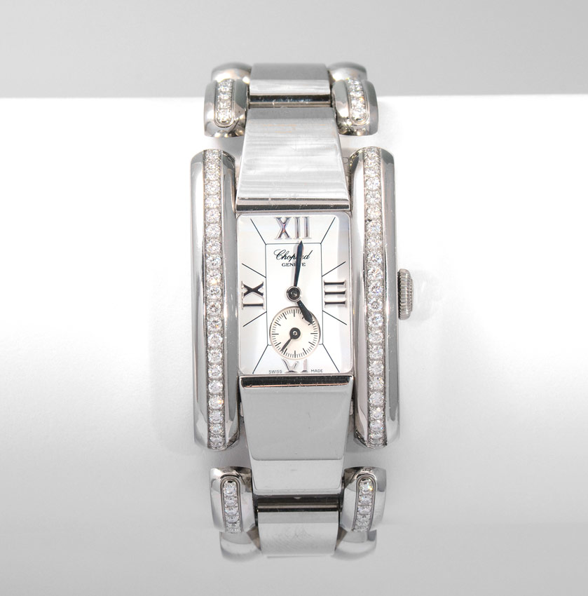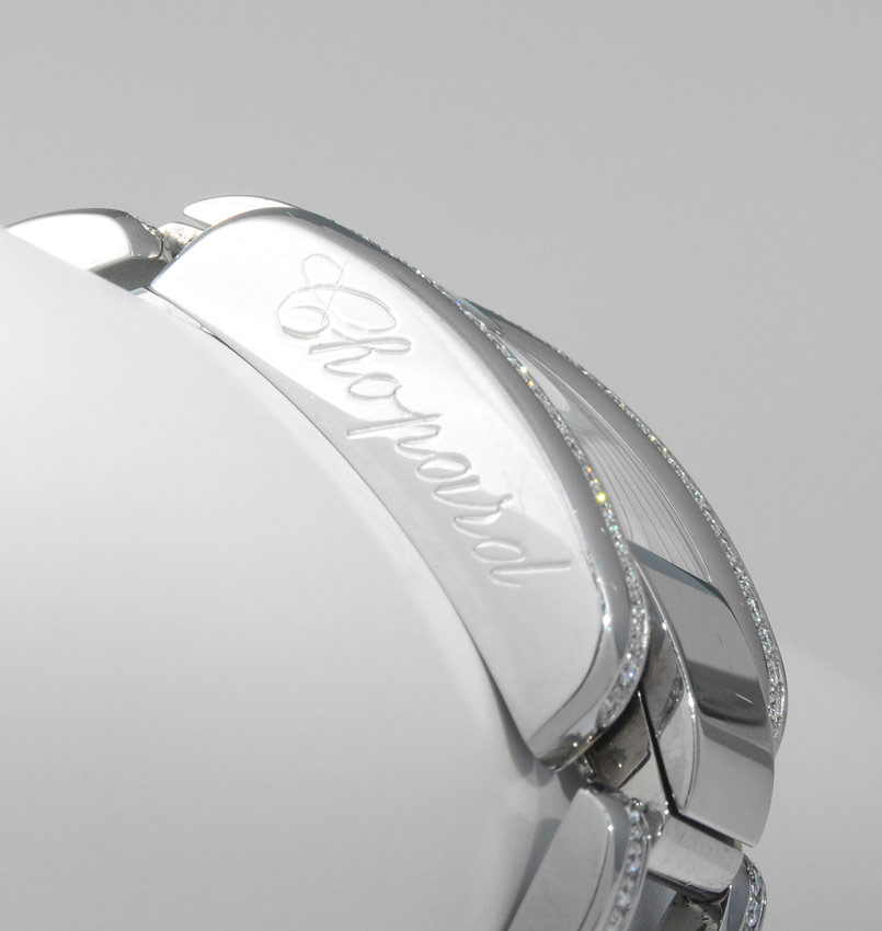 LADIES CHOPARD STAINLESS & DIAMOND WATCH: Stainless case and bracelet band. The bezel and first links are lined in diamonds. Quartz movement in working order. White dial, secondary dial, Roman numerals. Numbered 541/8415 761552 8357. Approx. 7''L.