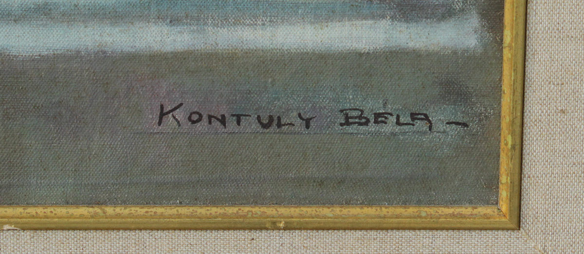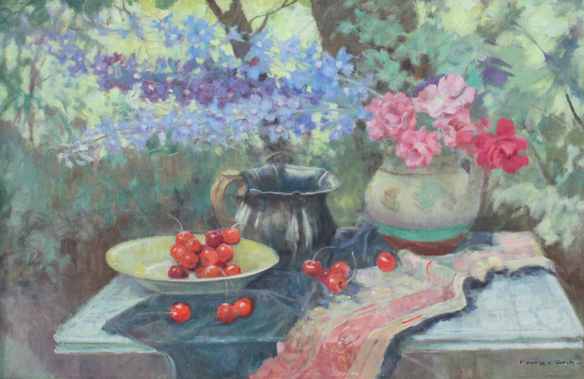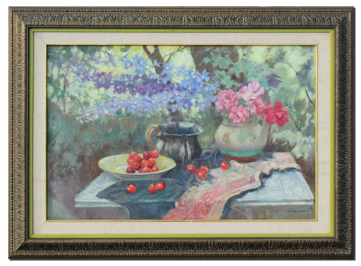 KONTULY, Bela, (Hungarian, 1904-1983): Still Life of Cherries, Water Pitcher and Flower Pot with Roses set on a Table in a Garden Landscape, Oil/Canvas, 23 1/2'' x 36'', signed lower right, carved frame with minor wear 34'' x 46 1/2''.