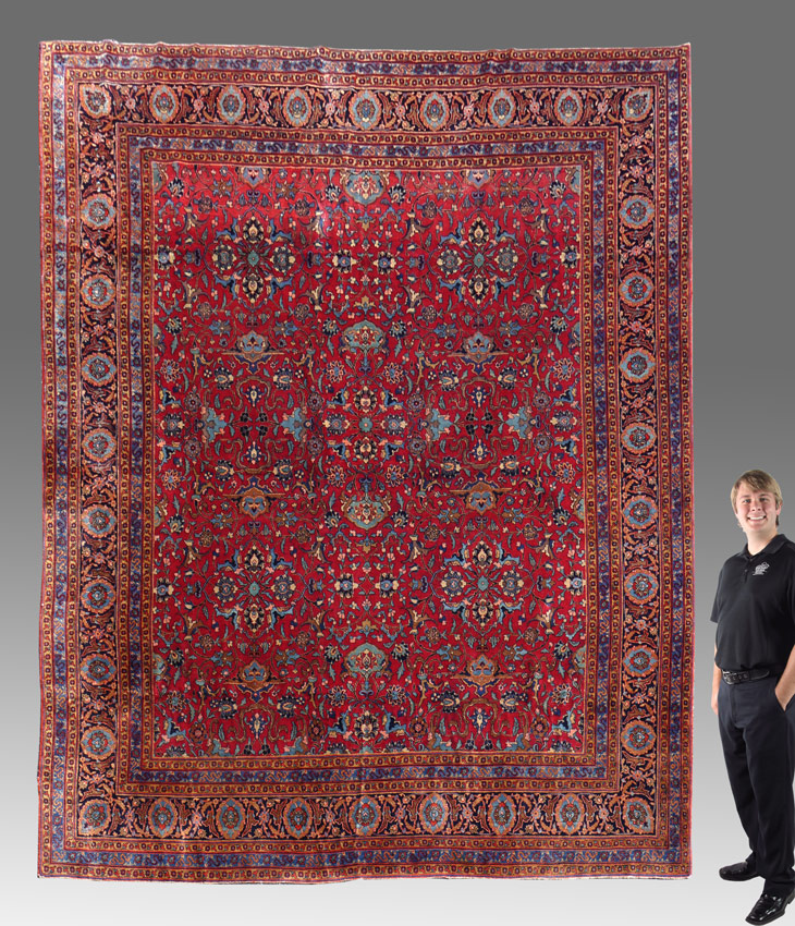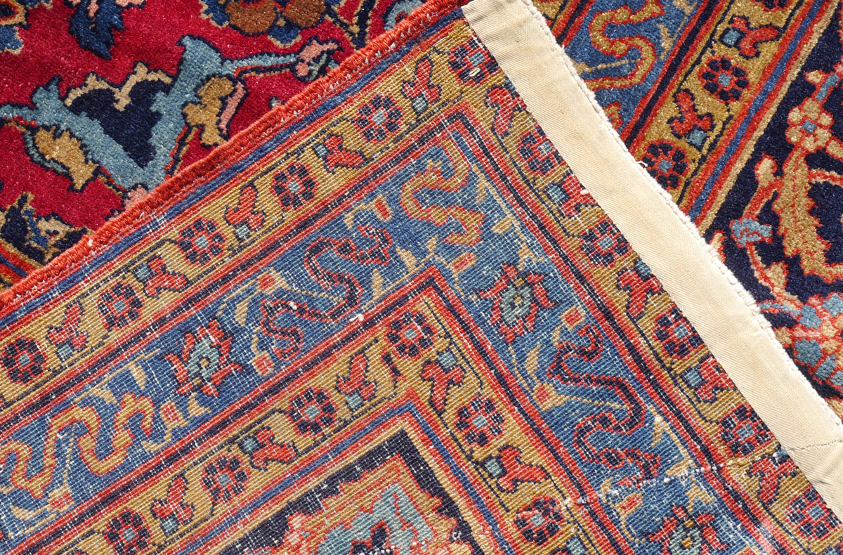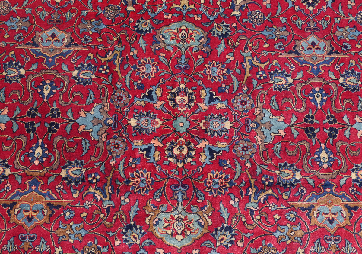 SEMI-ANTIQUE PERSIAN HAND KNOTTED WOOL RUG, 11' x 12' 8 1/2'': This almost square size Persian rug has many elements of design that would classify it as an Isphahan weaving. It has a beautifully drawn, balanced design of flowers and leaves in colors of pale and dark blue, peach, pale yellow, cream, red, and burgundy on a cherry red field. The flowers leaves and vines combine to form loosely drawn medallions that are placed in a very symmetrical fashion. There are three guard borders on either side of the main border, which consists of palmettes with leaves on either side. This is a very attractive rug.