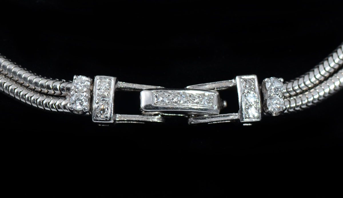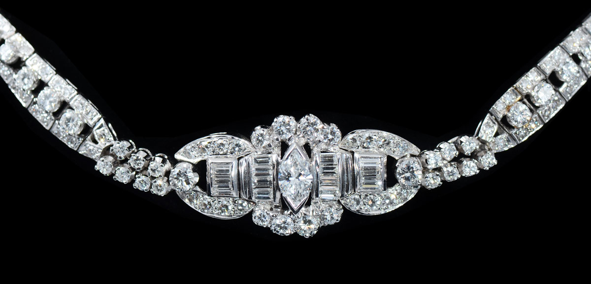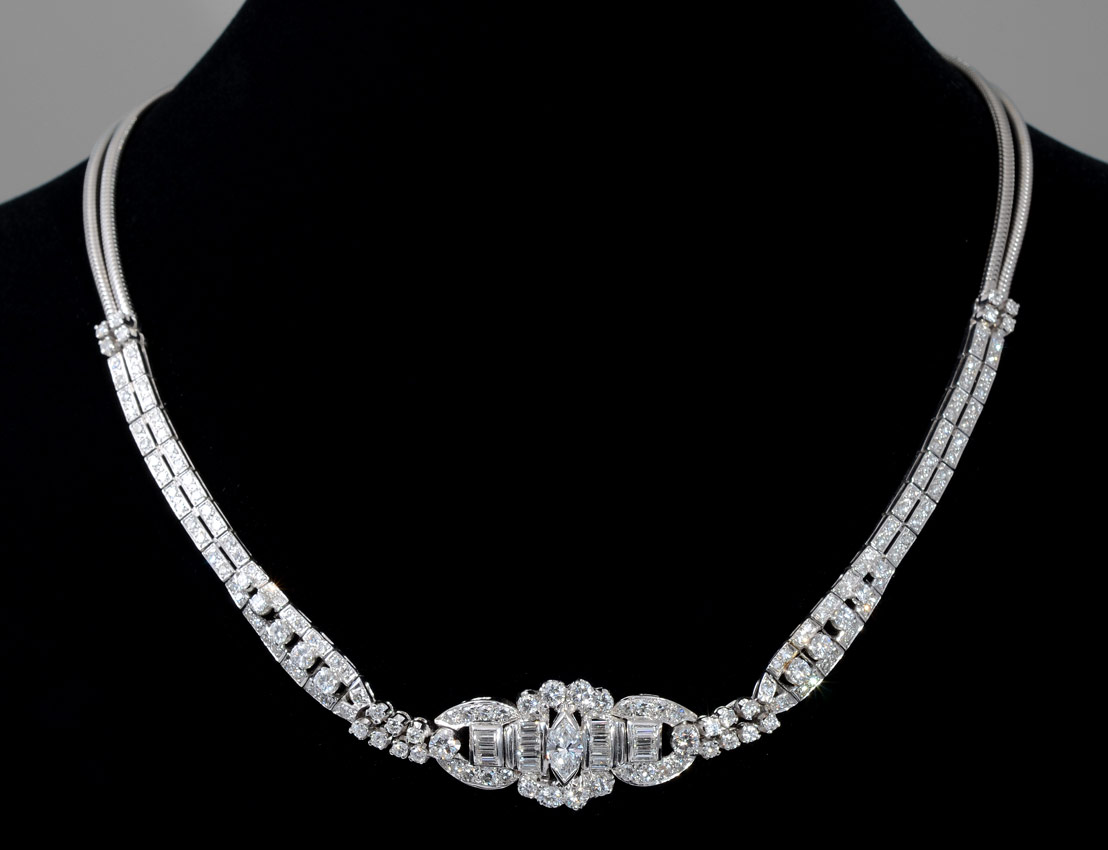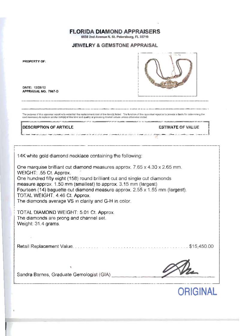 5 CT DIAMOND NECKLACE: 14K white gold necklace of diamonds. One .55 Ct marquise, 158 round brilliant and 14 baguette diamonds total approx. 5.01 Ct. Averaging VS in clarity and G-H color. Length: 15''. Weight: 31.4 grams. Sold with current Florida Diamond Appraisers GIA graduates appraisal for $15,450.