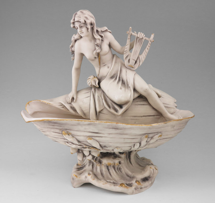 ROYAL DUX NUDE WOMAN ON SHELL COMPOTE: Semi nude woman with lyre seated on a seashell with crashing waves base. Royal Dux Bohemia ''E'' mark, dates from 1900-1918, impressed 2828 and 28 on base. 10 1/2'' h. x 10 1/2'' x 5 1/2''.