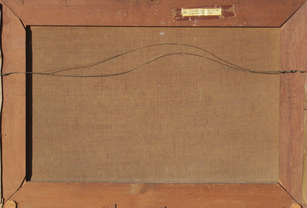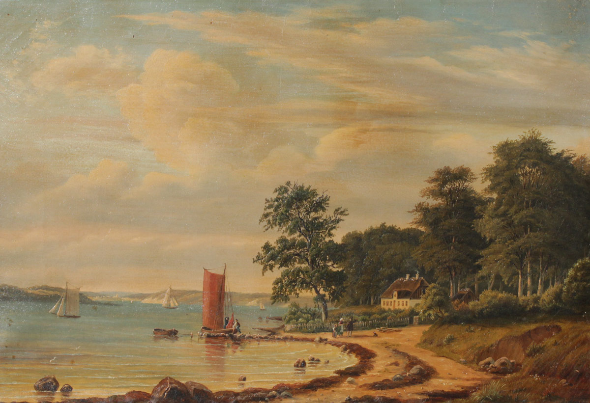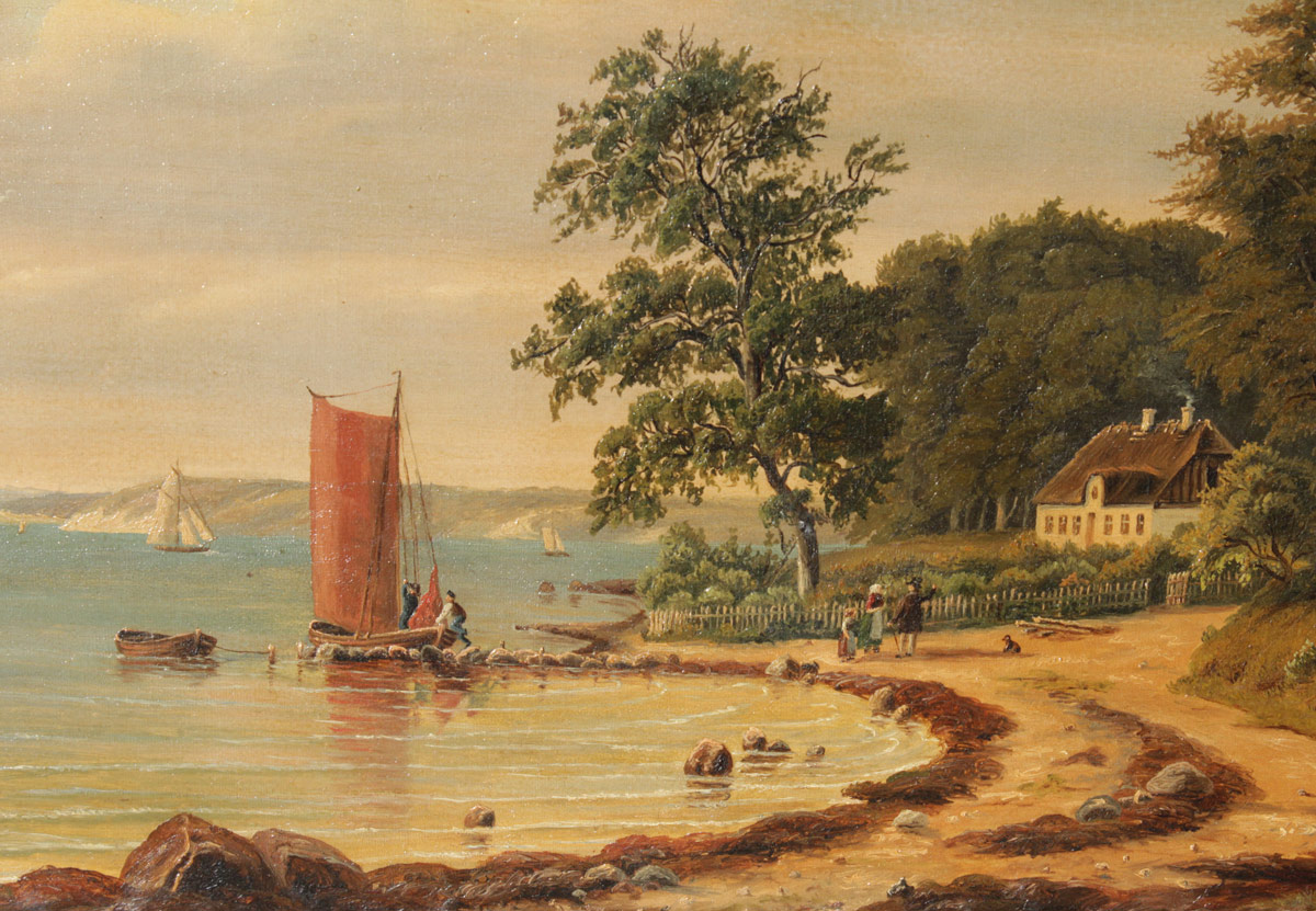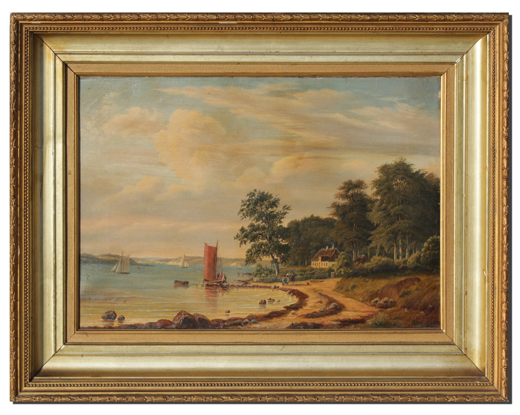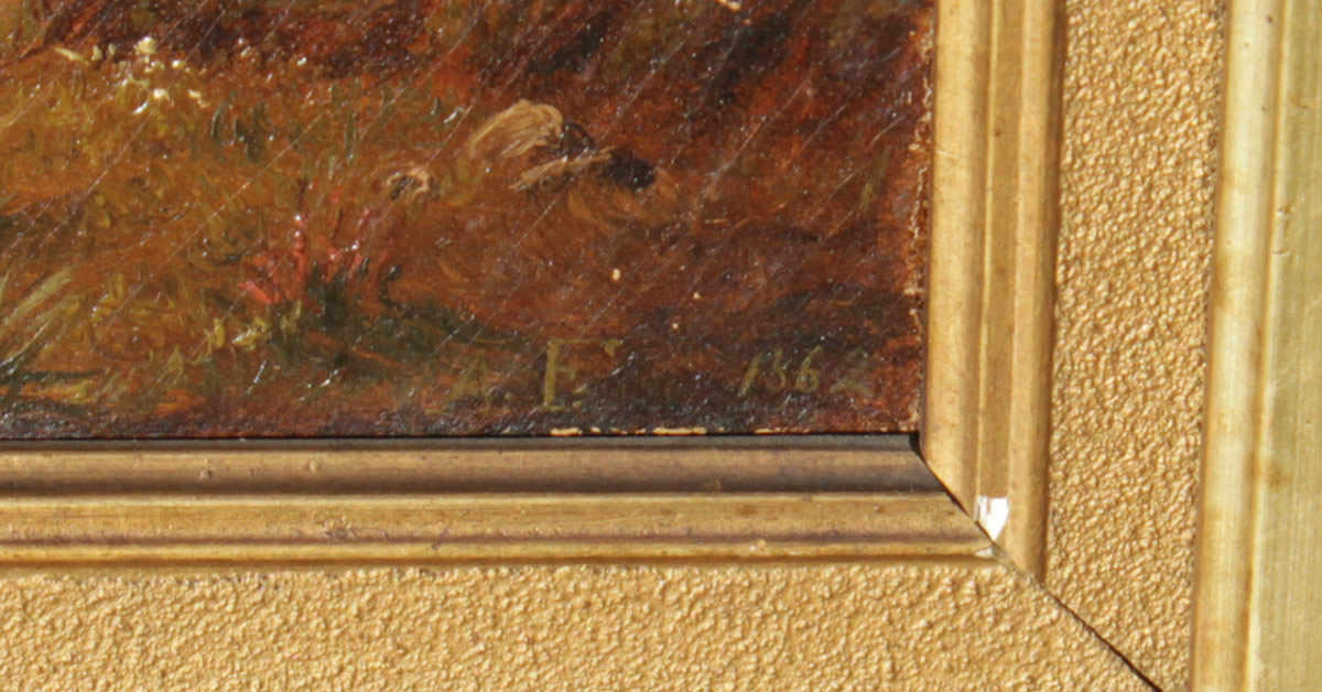 19TH CENTURY SHORELINE LANDSCAPE PAINTING WITH BOATS & FIGURES: Oil/Canvas, 15 1/2'' x 22 1/2'', monogrammed lower right A.F., dated 1862, gilded frame with minor wear and overpaint, 23'' x 30''.