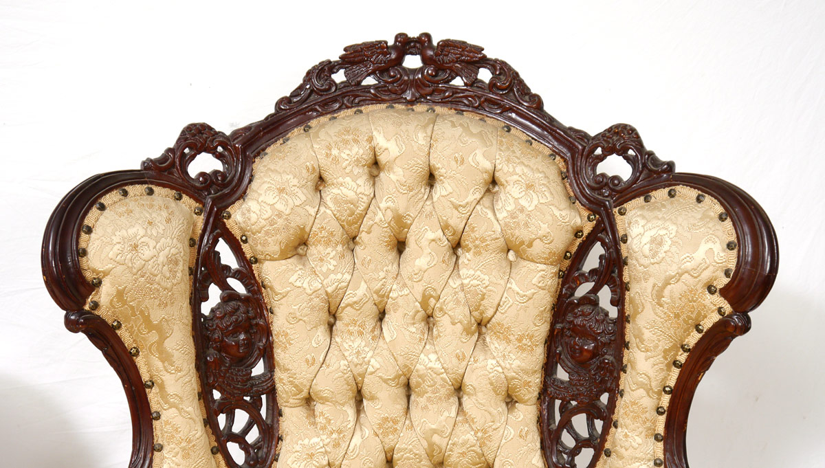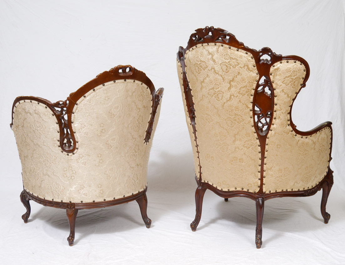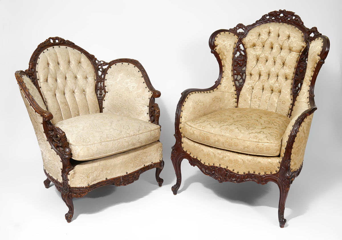 2 PIECE DEUTSCH BROTHERS CARVED CHAIRS: Attrib. to Deutsch Brothers to include 1) Parlor chair with carved birds crest, winged cherub busts on back, skirt and legs. Tufted back. 45'' h. x 32 1/2'' x 32 1/2''. 2) Barrel back chair profusely carved with foliate motifs. 37 1/2'' x 34 1/4'' x 30 1/2''.