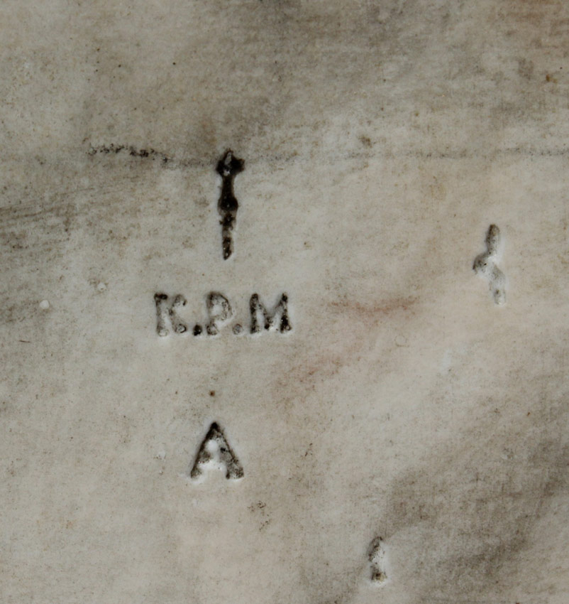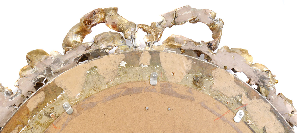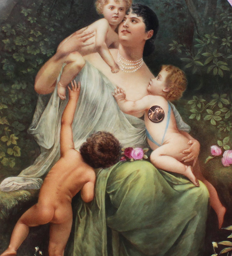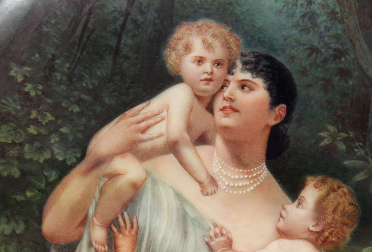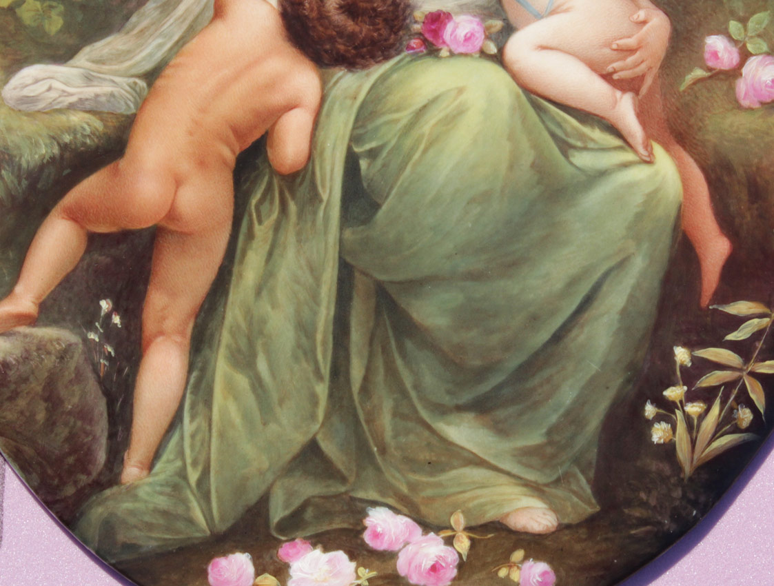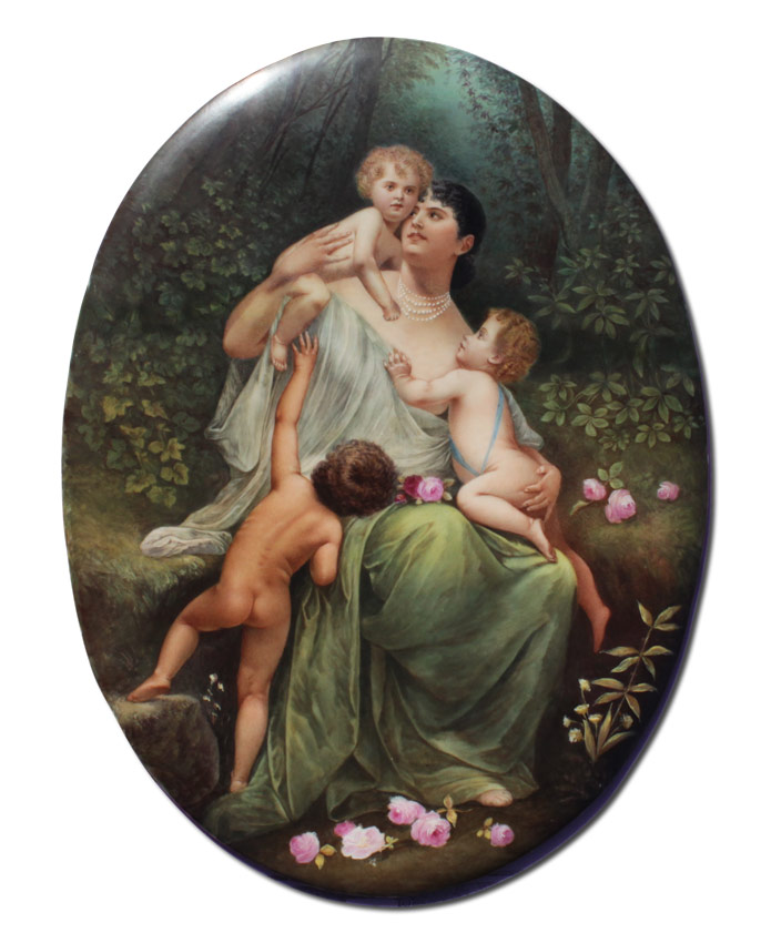 VERY LARGE EXQUISITE PAINTED PORCELAIN PLAQUE CIRCA 1910: Oval 19'' x 14 1/2'', spurious KPM mark impressed verso, Scene Depicts a Mother and Two Small Children in a Wooded Landscape with Roses, encased in elaborate gilded and carved gesso frame with floral and ribbon cartouche in need of repair, 48'' x 29'' x 3 1/2''.
