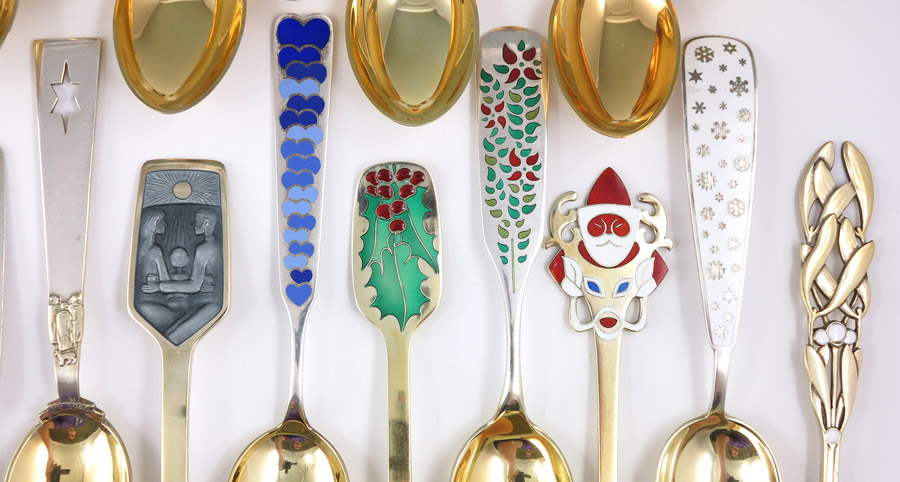 32 MICHELSEN DANISH STERLING CHRISTMAS SPOONS: Vermeil and enamel enhanced sterling with sporadic dates from 1924 to 1975. Approx. 47 troy oz. inclusive. Sold with 9 original boxes and some pamphlets.