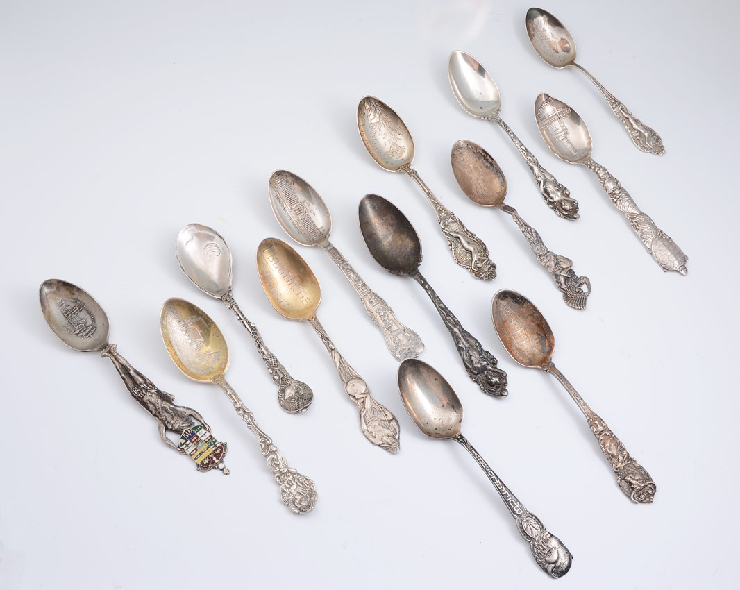 COLLECTION OF FIGURAL STERLING SOUVENIR SPOONS: 13 pieces to total to include 1-10) Figural souvenir spoons from assorted makers, places and towns to include Birmingham AL, Los Angeles, St. Louis, Buffalo NY, Omaha 1898 Exposition, University of Toronto, Mt. Pleasant MI, Louisiana Purchase Exposition, Telluride CO, Baltimore. 11) Paye & Baker teaspoon with unique crab and net body, oyster shell bowl. 12-13) Pair Reed & Barton figural teaspoons, each with engraved name. Approx. 12.3 troy oz.