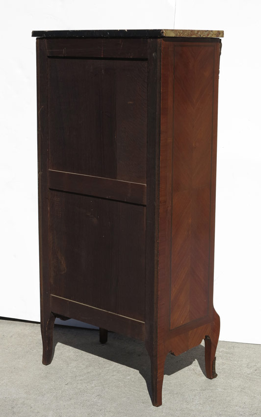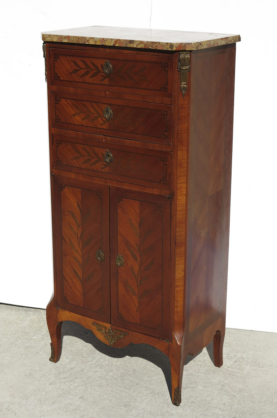FRENCH STYLE MARBLE TOP INLAY CABINET: Lingerie type chest, variegated marble top over 3 drawers and 2 doors, shaped skirt with ormolu accents. Marquetry inlay on drawers and doors. 51 3/4'' h. x 35'' x 14 3/4''.
